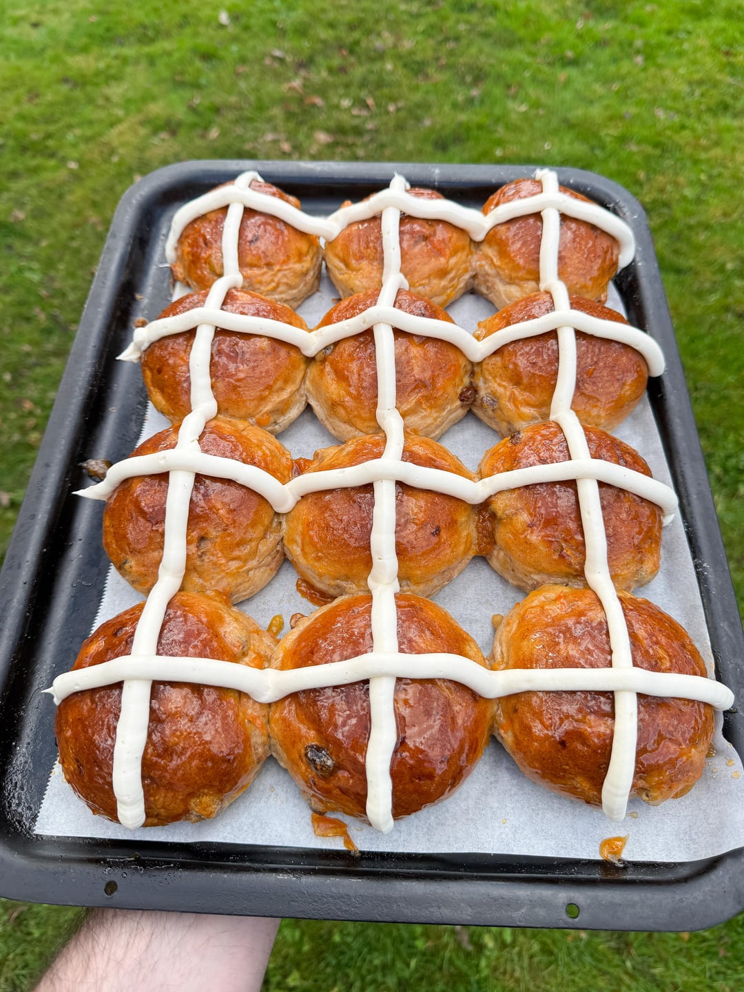 Hot cross buns & carrot cake combined! The buns are made with a tangzhong & are full of rum soaked fruit, grated carrot & toasted walnuts. The crosses are cream cheese frosting!