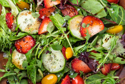 Rinse all fruits and vegetables under cool running water before use. Place arugula, cucumber, tomato and strawberries in a large bowl. Add vinaigrette and toss gently until evenly distributed. Divide evenly onto serving plates and serve immediately