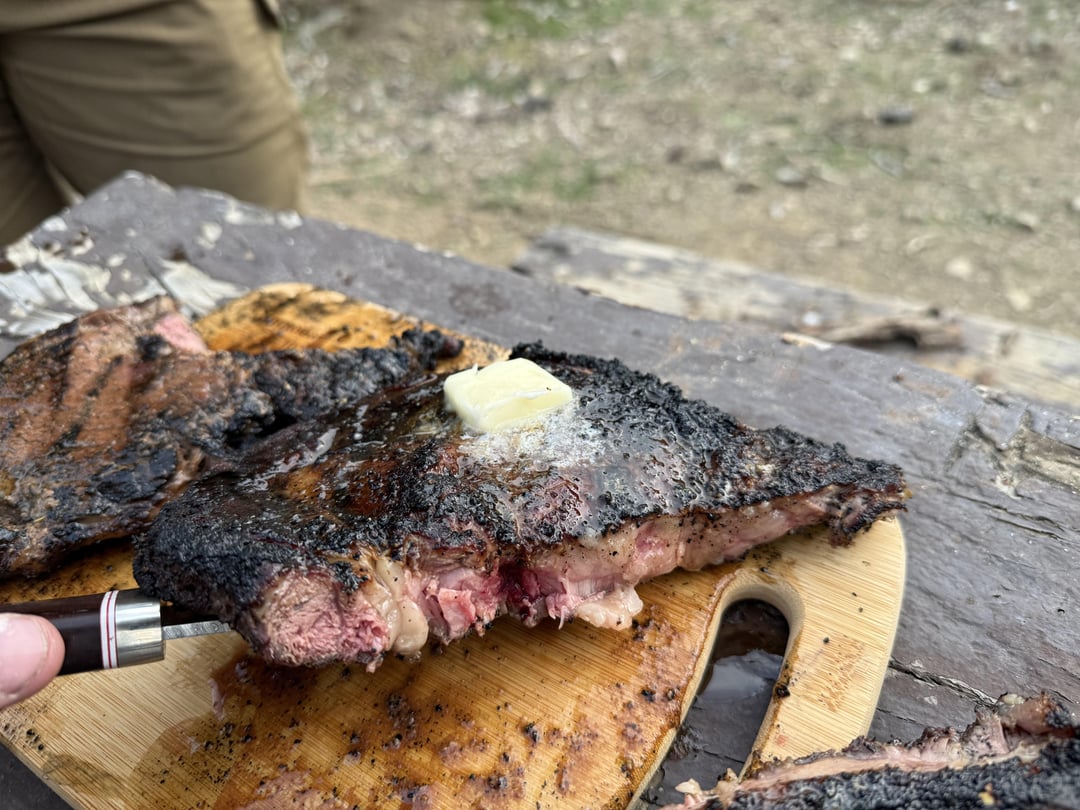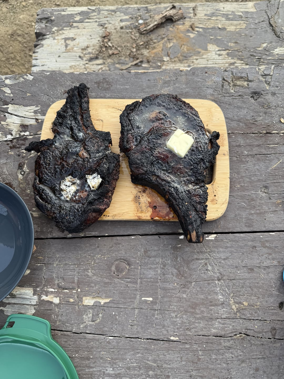 So just a reminder to everyone that the crust on a steak is normally the maillard reaction, its not you actually burning the outside of it. These are charred and burnt, you can tell because the meat is the same color as the burnt bone which doesn’t normally brown like this when getting a good sear. That being said, it probably still tasted great. I think you just gotta take those steaks a little further from the flame next time.