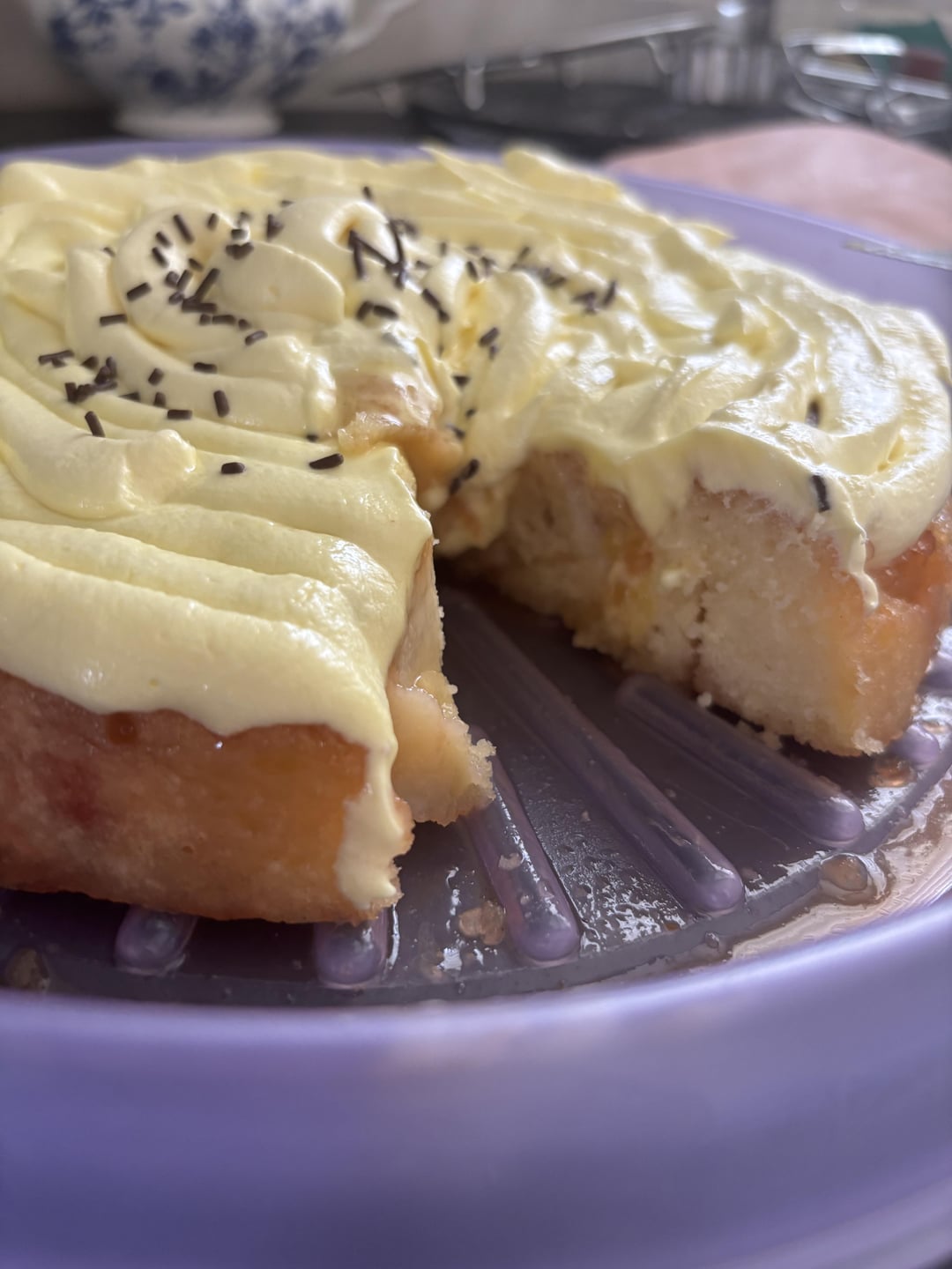 Interesting! When I’m feeling indulgent/lazy, I sometimes make upside down pineapple cake minus the pineapple; I’ll whip up some caramel, pour over the sponge mix, bake, flip, slice, and serve warm with double cream (or ice cream if you wanna be really decadent). Never thought about adding any kind of frosting before; I kinda want to try layering the cakes with something, like an extra sweet Victorian sponge, so this has given me ideas.