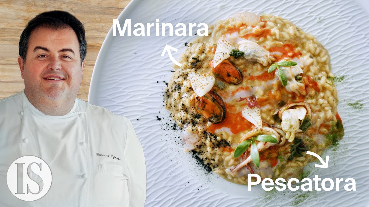 Il risotto di mare ha forse tante varianti quante sono le località costiere della penisola Italiana. Un piatto versatile, iperstagionale, che ha messo alla prova generazioni di chef. Gennaro Esposito, due stelle Michelin al ristorante Torre del Saracino di Vico Equense, ha unito la tradizione a base di pomodoro (marinara) con il più classico risotto ai frutti di mare o alla pescatora. Ne è nato un piatto tecnico, di estrema creatività, che gioca con sapori e consistenza, ma anche con l’utilizzo di ingredienti insoliti, come il matcha.