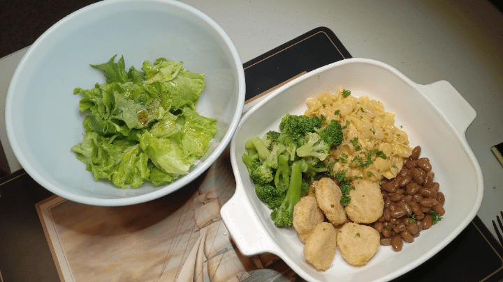 Childs Play – beans, mac and cheese, chicken bits, broccoli