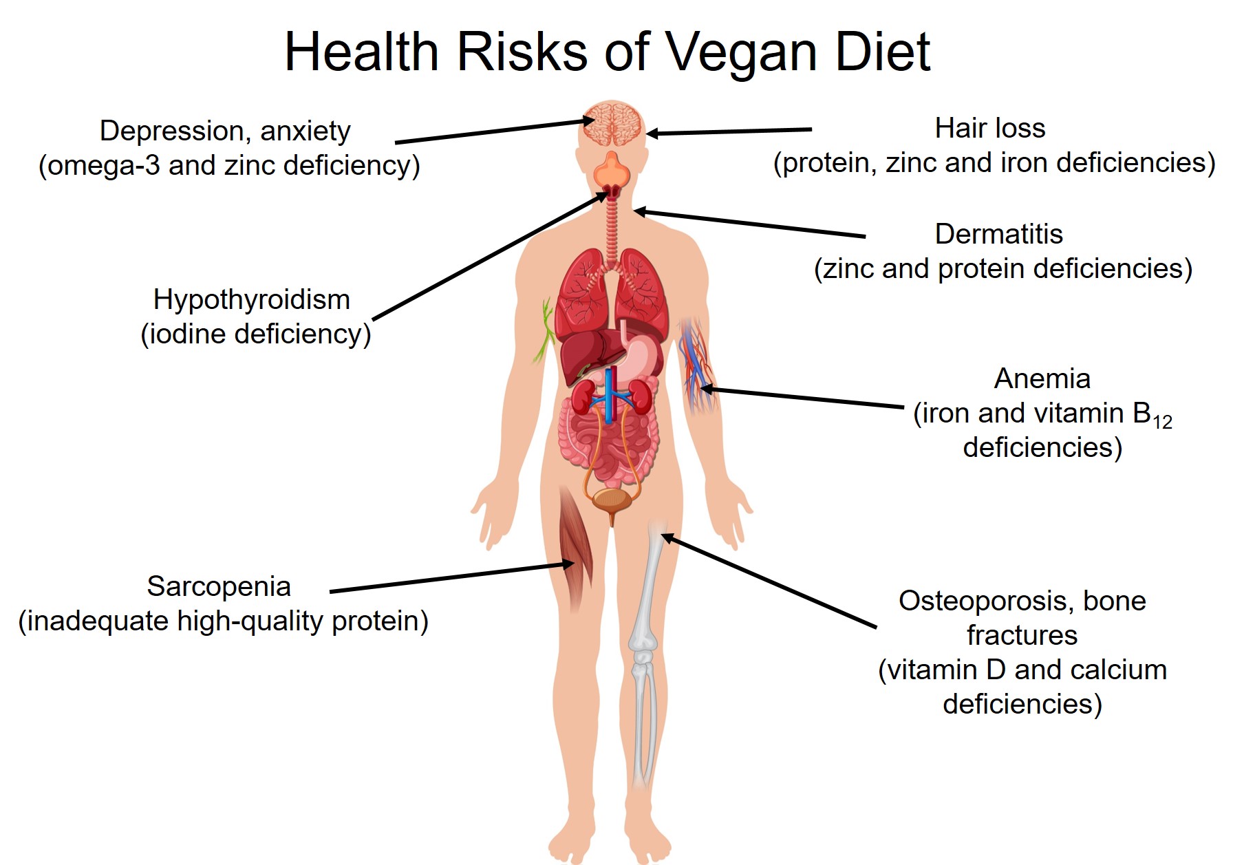 Compared to the standard American diet of highly processed, low-fiber, high-calorie, sugary foods, vegan diets have some health advantages. However, researchers found that avoiding all animal foods may lead to nutritional deficiencies in vitamin B12, omega-3, calcium, zinc, iron, magnesium, and high-quality protein.