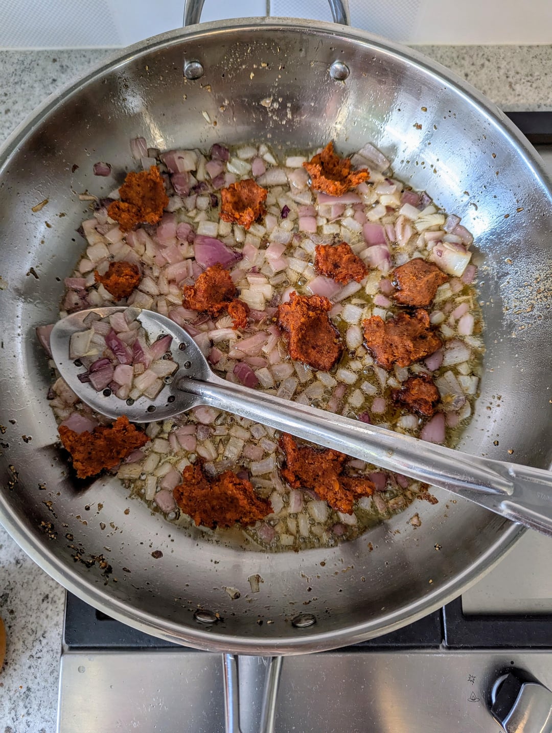 Add the reserved fat back to the same pan and fry your onion until soft and translucent and then add the 'nduja in pieces as per the image. Melt this down with some of the cooking water to help emulsify. Add the cherry tomato slurry and begin mixing. Bring to boil then turn off the heat. Add your pasta and cook. If it's fresh pasta, will only take like three minutes otherwise and in any case, obviously cook it until all dente.
