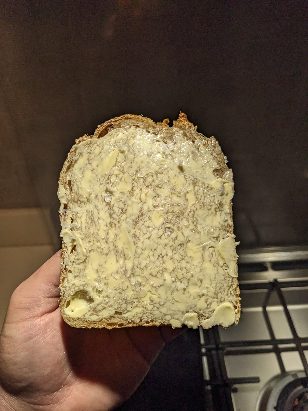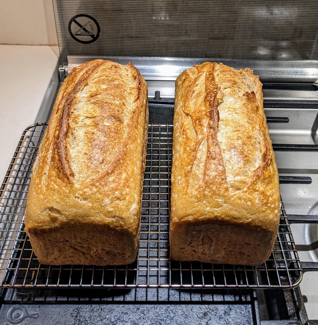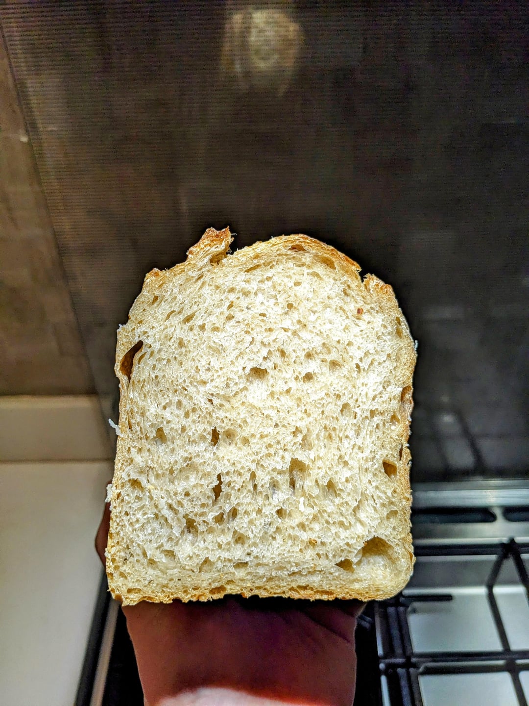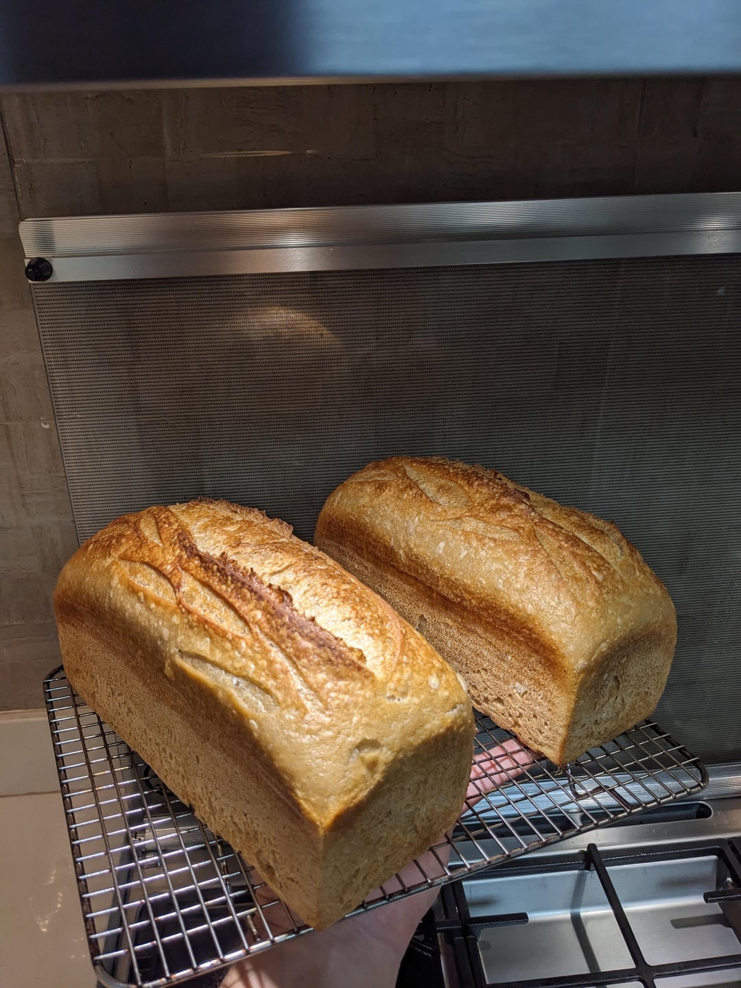 I don't care about boules so I made loaves in my 9×4 pullman pan. Tasted better than any other yeasted bread I made. Crumb is a bit sticky, I think because it overfermented? Kept in the fridge for 48 hours before baking.