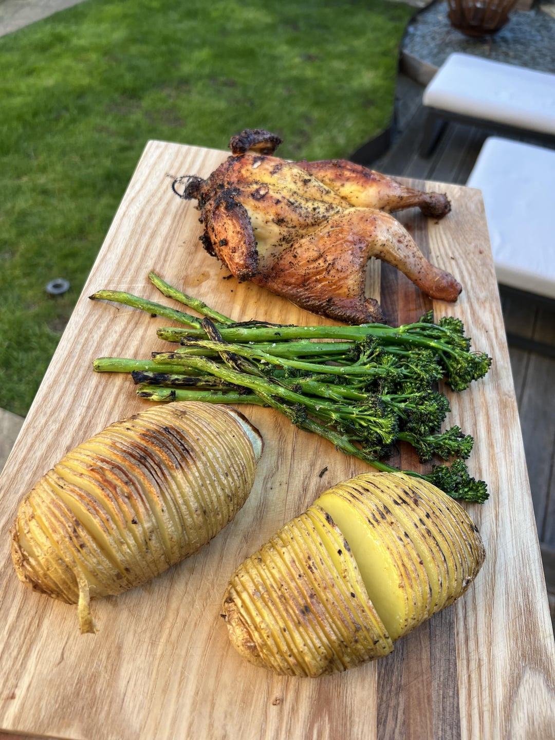 Small little spatchcock poussin (simple salt and 4 pepper rub) rosemary and garlic hassleback potatoes and tender stem broccoli.