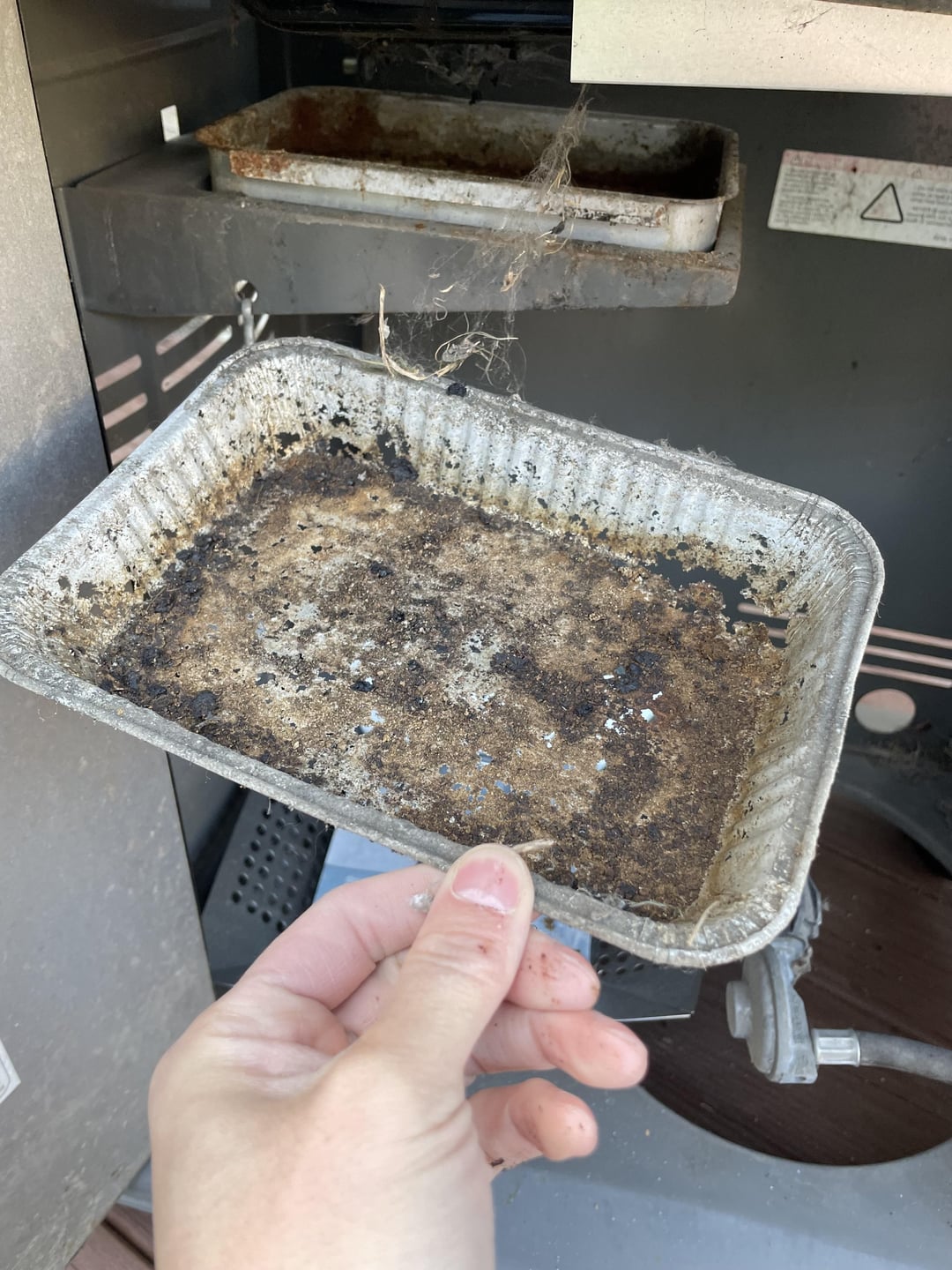 Take a plastic paint scraper and scrape off most of the gunk on the grease pan (4th picture). You can also scrape off the firebox. The foil grease tray looks like it has holes but it’s meant to be disposable. Replace that. Other than that it looks like it’s in great condition.