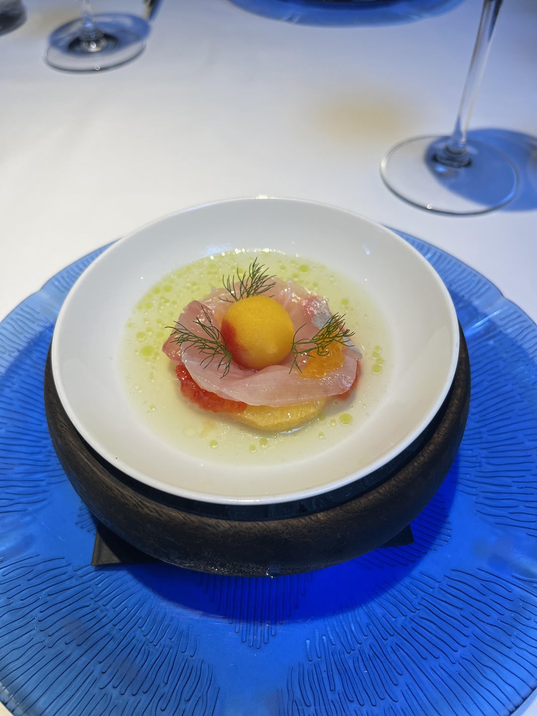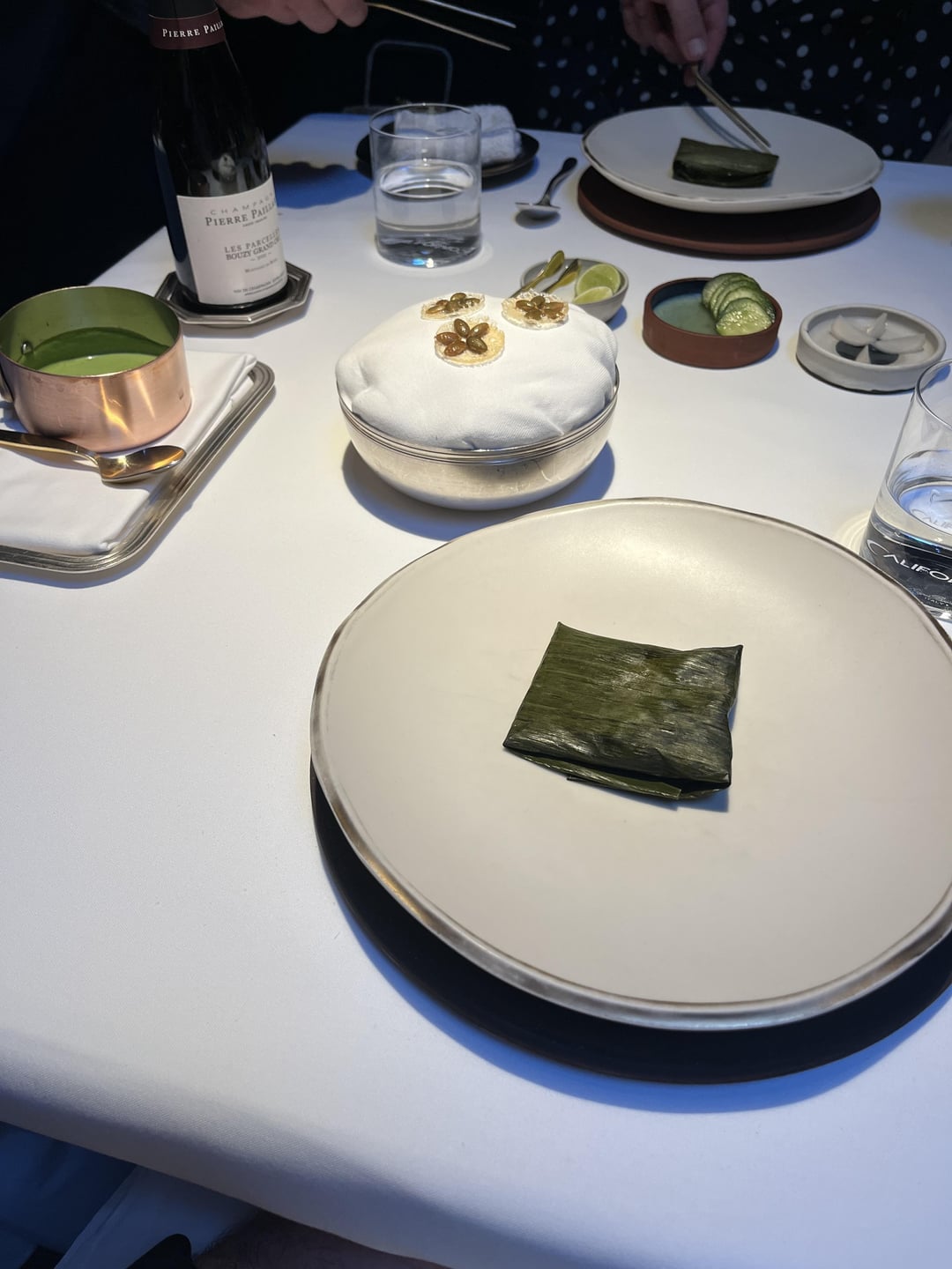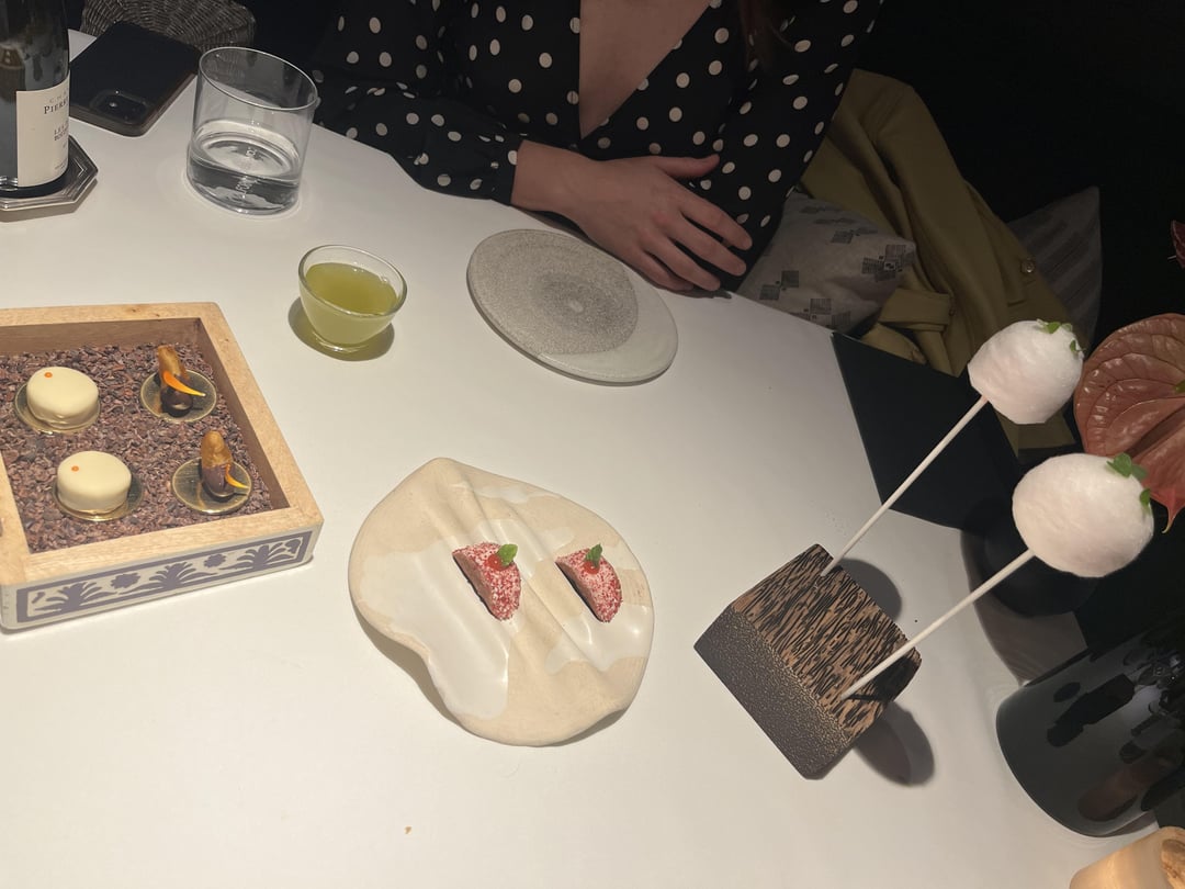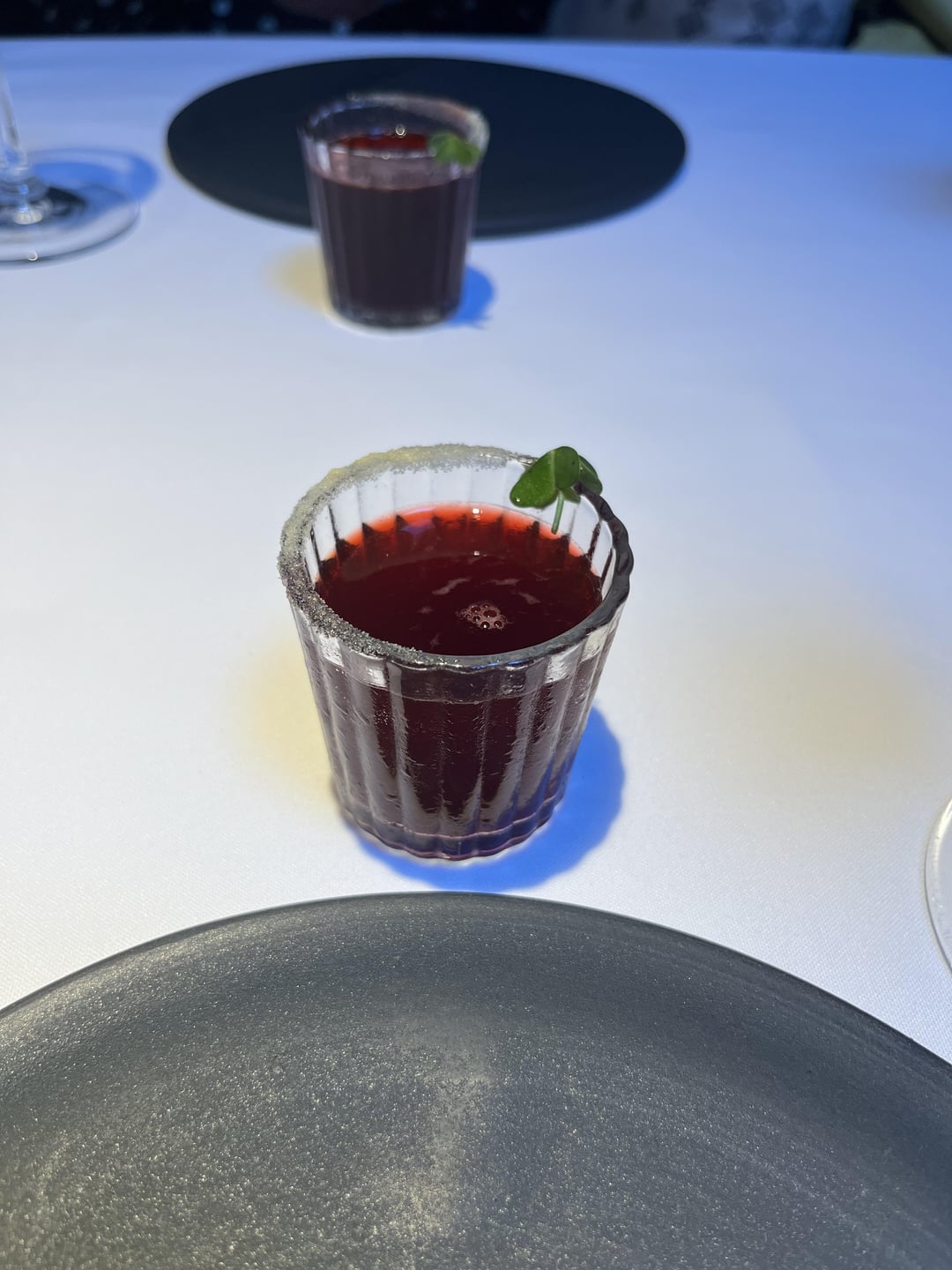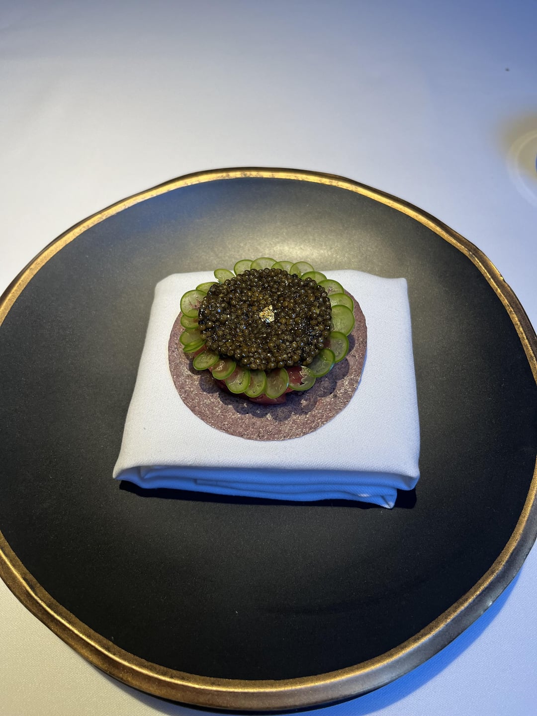 – Drink service: The biggest miss of the night. We ordered a half bottle of champagne to start, which we finished by the 3rd course (minor point, we served ourselves and no one came to check in). After that the empty bottle was never picked up and remained on the table until the end of the night (3.5 hours later). We ordered some cocktails that were just ok, that took 45 minutes to come to us after we ordered. Lastly, we each got a glass of wine for the last 2 savory courses. After we finished the wine, no one picked up the empty glasses and instead servers would move them around on the table to make space for the different dessert courses for the next hour – it was just so weird? I had to politely ask to have the glasses retired before someone took them. Lastly, our water carafe was regularly empty, and very few times someone came to check in on us
