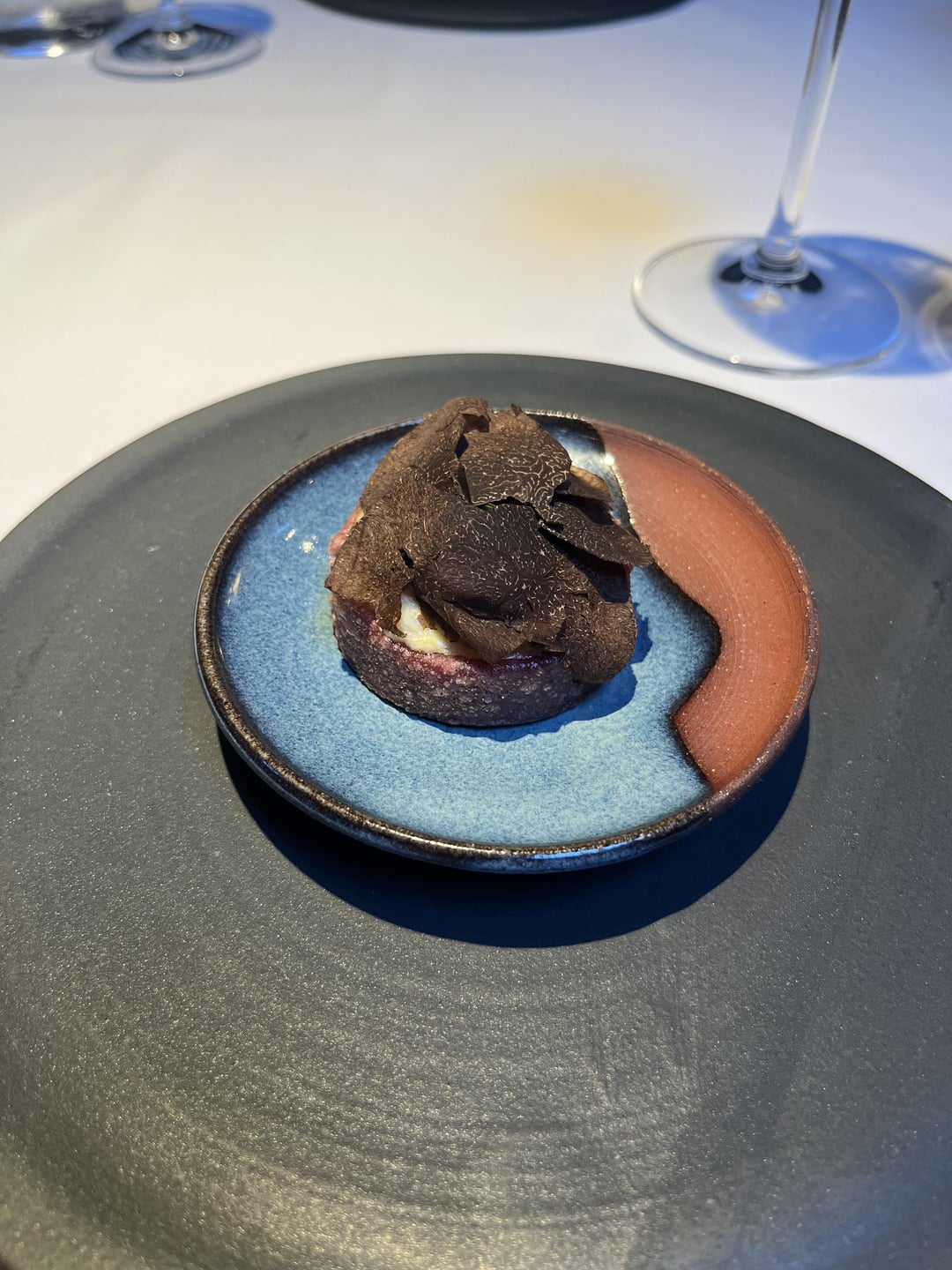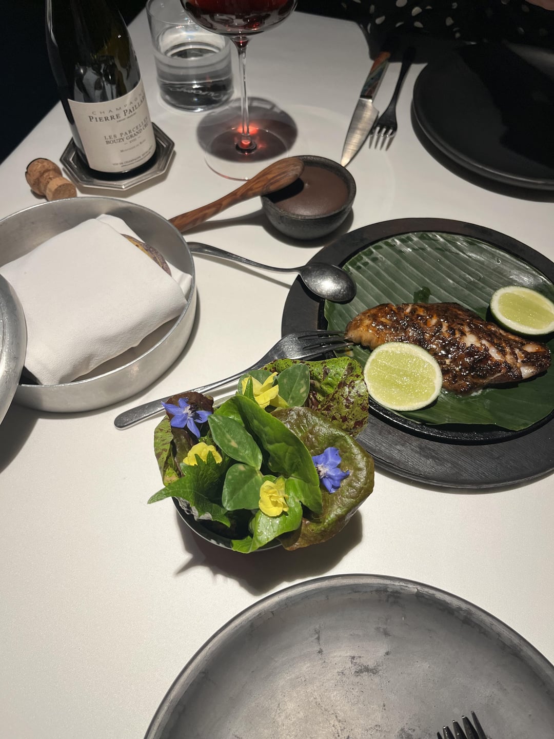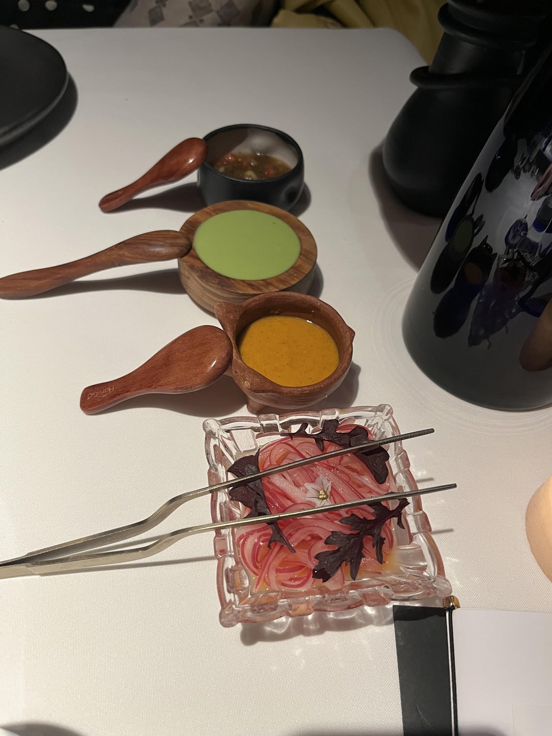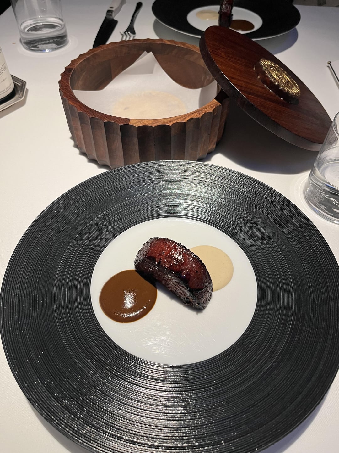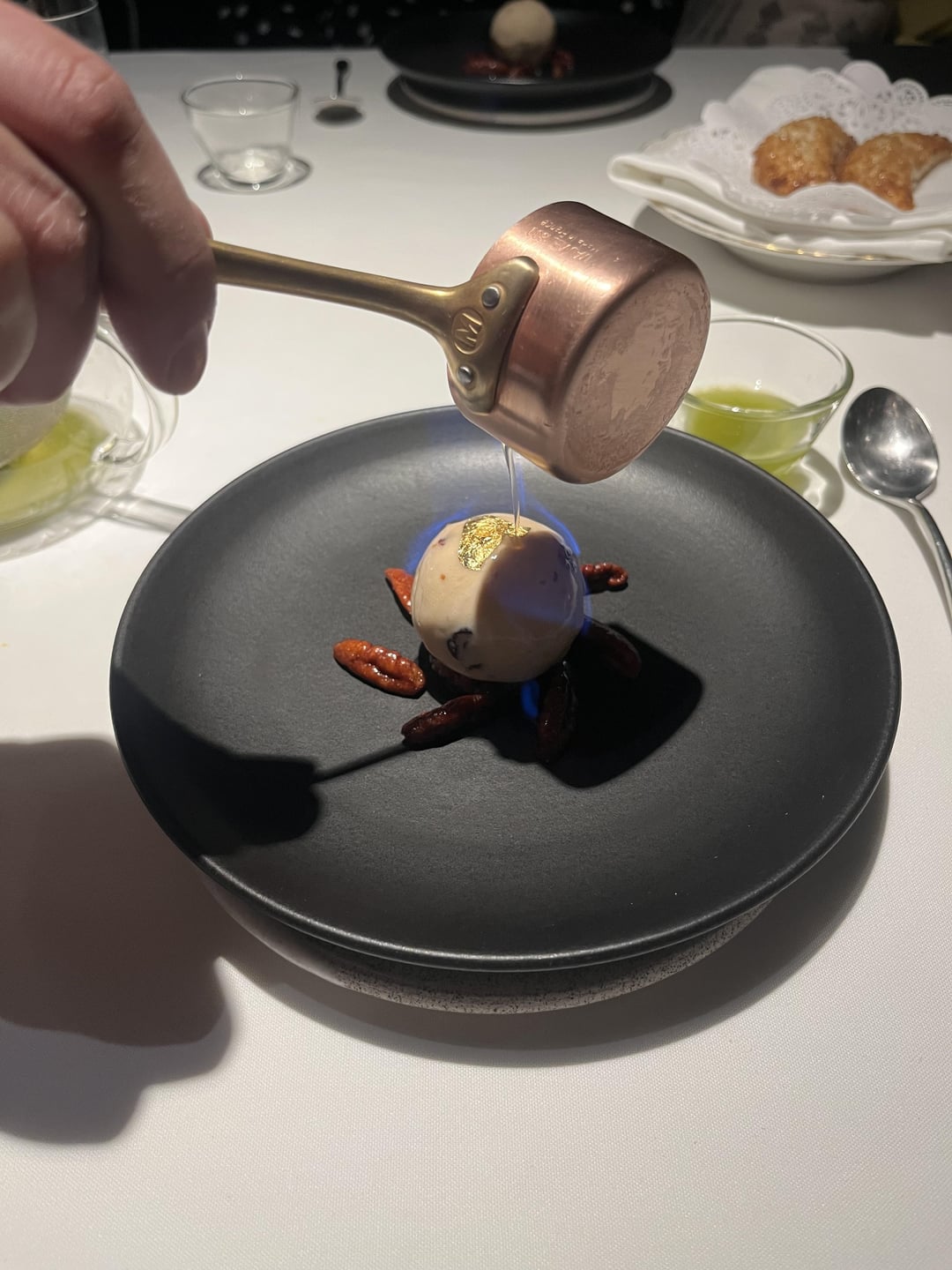 – Drink service: The biggest miss of the night. We ordered a half bottle of champagne to start, which we finished by the 3rd course (minor point, we served ourselves and no one came to check in). After that the empty bottle was never picked up and remained on the table until the end of the night (3.5 hours later). We ordered some cocktails that were just ok, that took 45 minutes to come to us after we ordered. Lastly, we each got a glass of wine for the last 2 savory courses. After we finished the wine, no one picked up the empty glasses and instead servers would move them around on the table to make space for the different dessert courses for the next hour – it was just so weird? I had to politely ask to have the glasses retired before someone took them. Lastly, our water carafe was regularly empty, and very few times someone came to check in on us