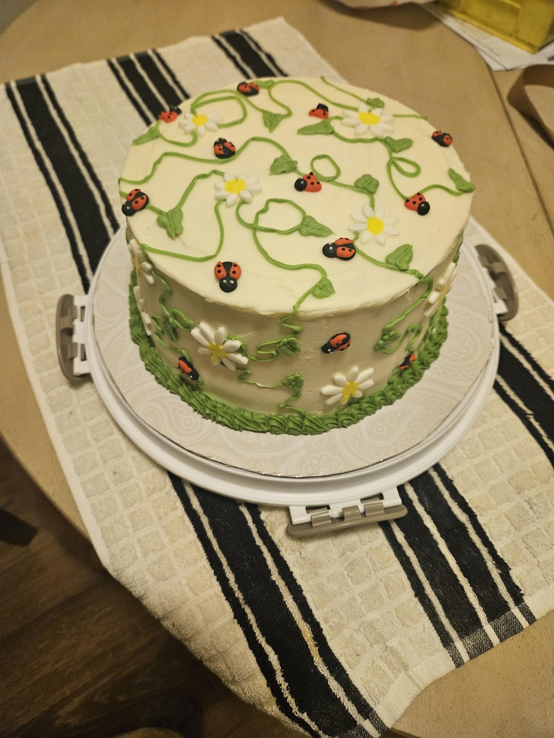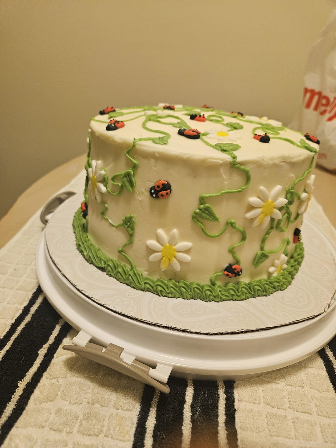 If anyone is curious, it's a 3 layer lemon cake with lemon cream cheese frosting and a raspberry curd filling. The flowers are marshmallow fondant and I bought the ladybug decorations because they were making me too anxious.