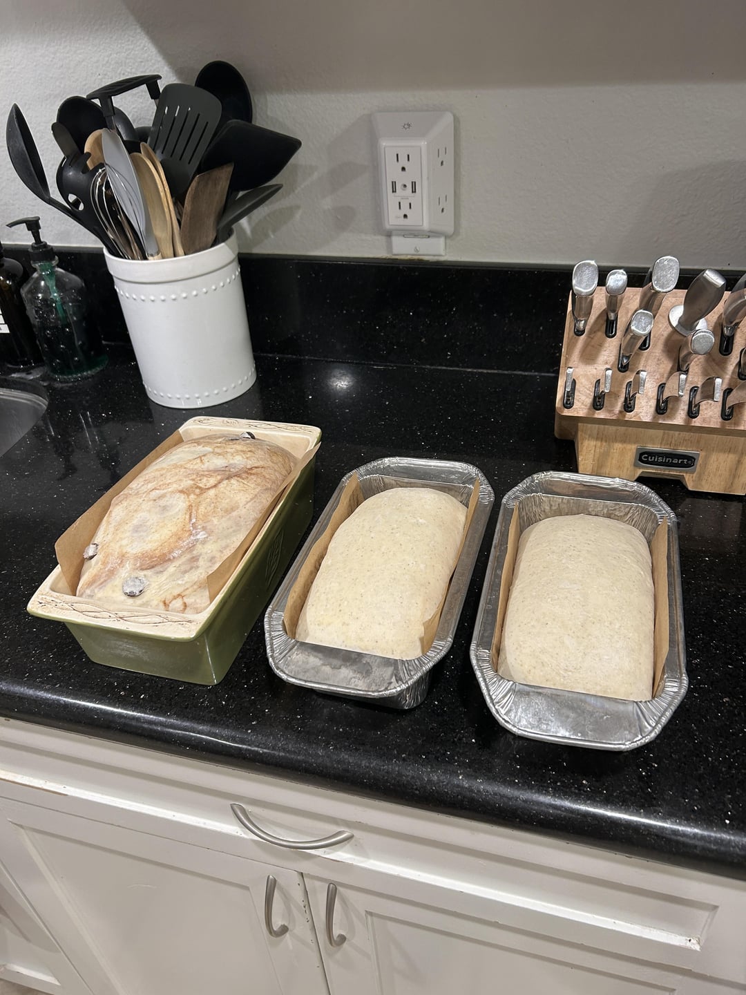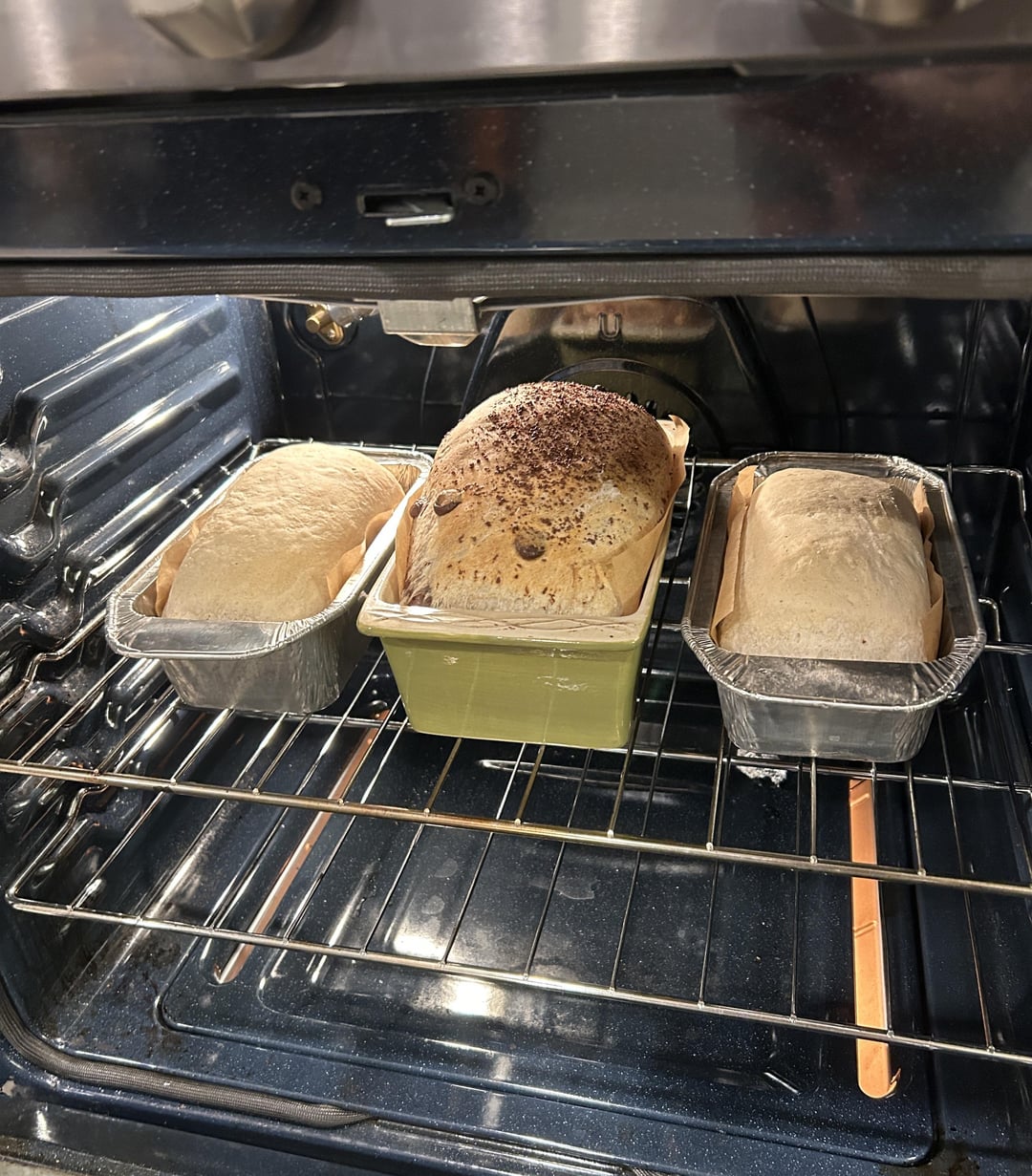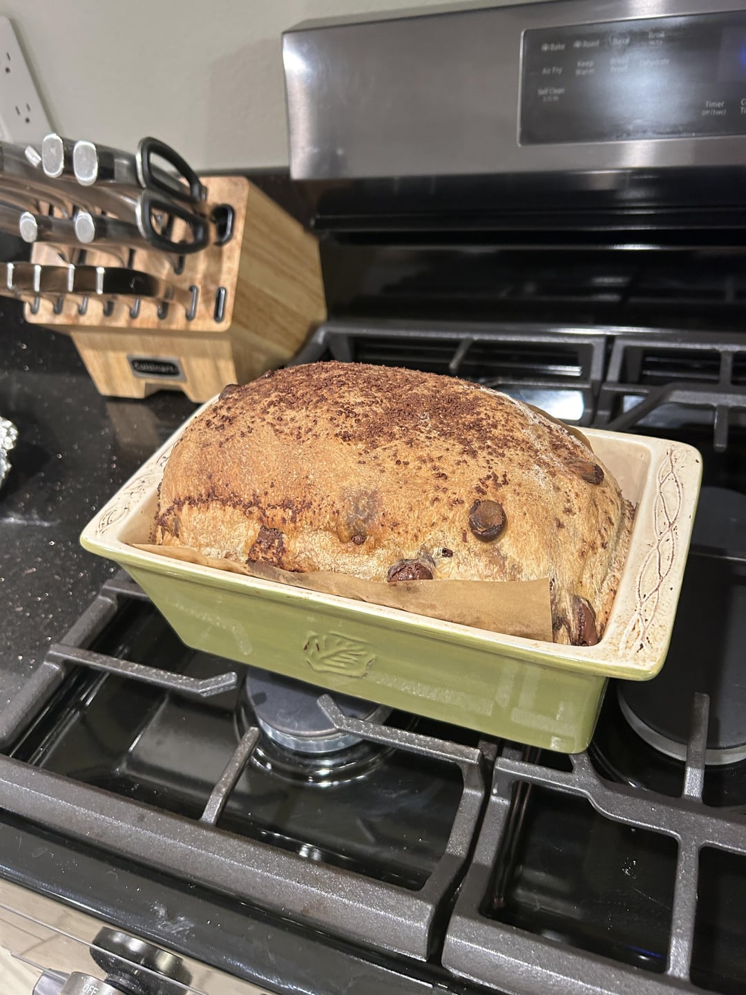 Recipe + process: 500g flour, 10g salt, 140g active starter, 340ml water (10ml less for chocolate cinnamon sugar loaf, plus 50g sugar, 50g chocolate chips, and just adding as much or as little cinnamon as you want during the shaping process, a recipe I experimented with myself). 1 hour rest, 3 sets of stretch and folds 45 minutes apart. Let it bulk ferment until it reaches about 55-70% of its original size, shape it, and instead of putting it in a banneton, put it in a bread loaf pan. Leave it again to rise for a couple of hours until it’s expanded well in the pan a healthy amount. I lined mine with parchment paper and sprayed them with olive oil before the parchment paper to prevent sticking. The small loaf pans are disposable ones, and it’s the same recipe just divided into two loaf pans. Oven temp is 375. In the small metal pans, I baked for 35-40 minutes, and for the sweet loaf in the large ceramic pan, I did about 50-55 minutes, tenting it with foil when it started to brown more.