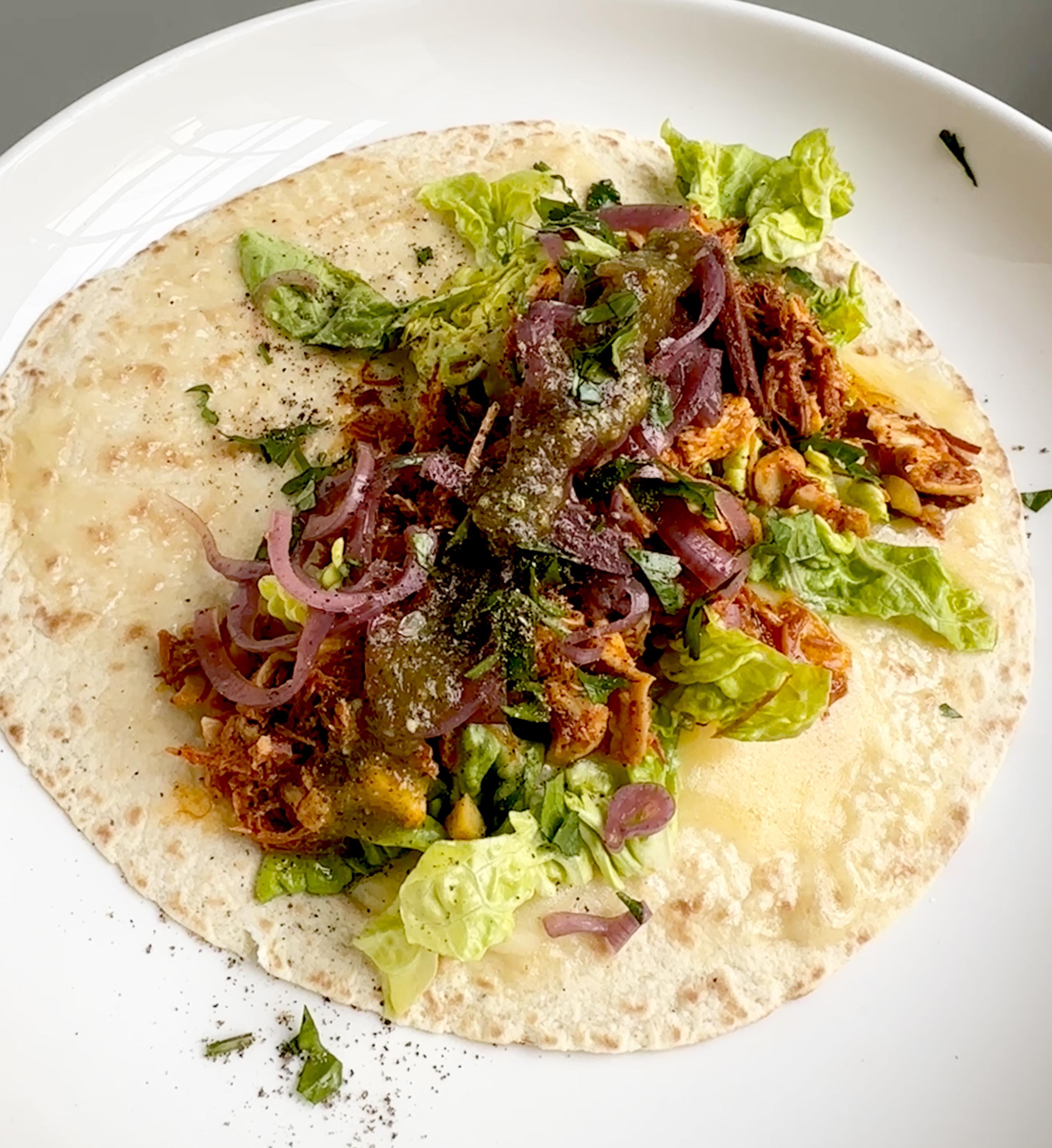 This 'taco' has lettuce (needed eating + I need the vitamins), roast chicken, Cochinita Pibil, some very sad pickled red onions, coriander and salsa verde. (+ melted mild cheddar; so technically a quesadilla)