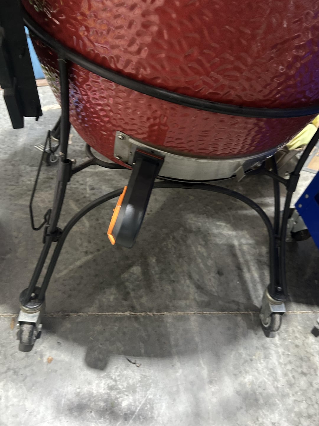 It appears the left side of the upper ring support rod/post is out of the sleeve of the lower support ring (2nd picture). I noticed this because my Kamado was assembled and delivered with two of the upper ring supports not seated in the sleeve causing it to be uneven. Careful inserting it into the sleeve, I almost tipped mine over when I pushed them in causing the kamado to abruptly drop onto the lower support ring.
