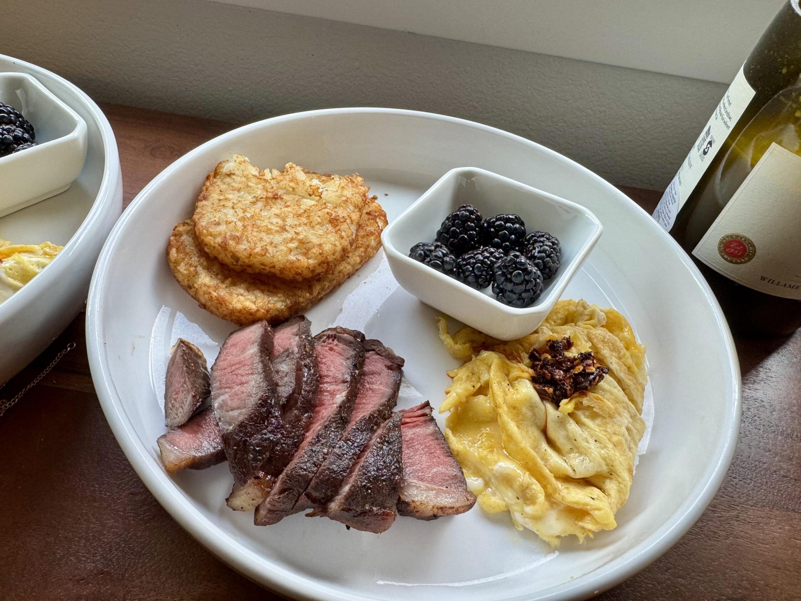 Found a $5 “Wagyu” steak at the market, seasoned with SPG and threw it into bath at 132° around 8pm for a few hours and then ice bathed and into the fridge. Dryed and seared this morning and then eggs into the same pan.