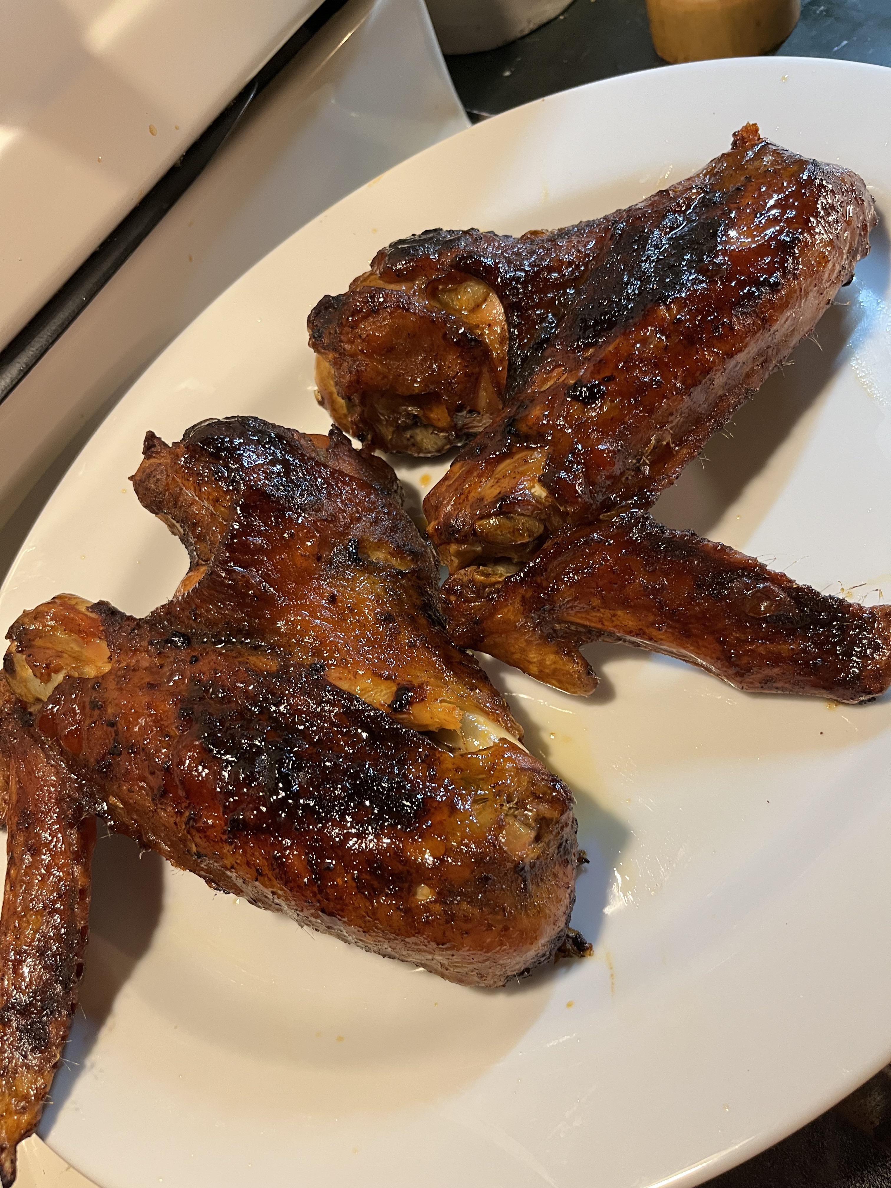 They came out really well. Crispy and well cooked —the way I prefer turkey wings. Oven baked at 325° F for 2.5 hrs. They were a little pricey, however. 10 bucks apiece, but big. For scale, they are on a very large serving platter. They make it look like a dinner plate!