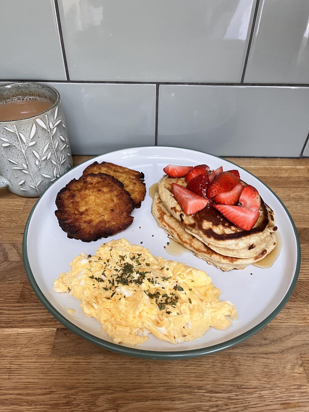 I used this [recipe](https://www.allrecipes.com/recipe/24530/buttermilk-pancakes-ii/) for the buttermilk pancakes and added in a few scoops of PhD Diet Whey vanilla protein powder!