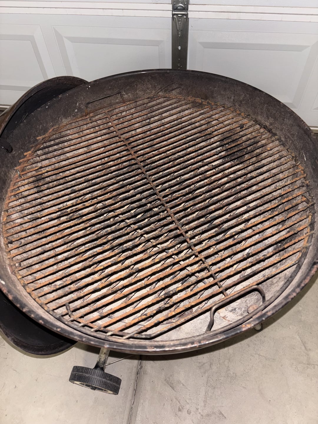 I have the same one. I’d clean the inside of the lid with water and a scouring pad to knock any creosote off. Then I’d hose the whole thing inside and out with the hose. Last, get the slow n sear and new grill grate. If you’re going to smoke in it, I’d get the LavaLock gasket.