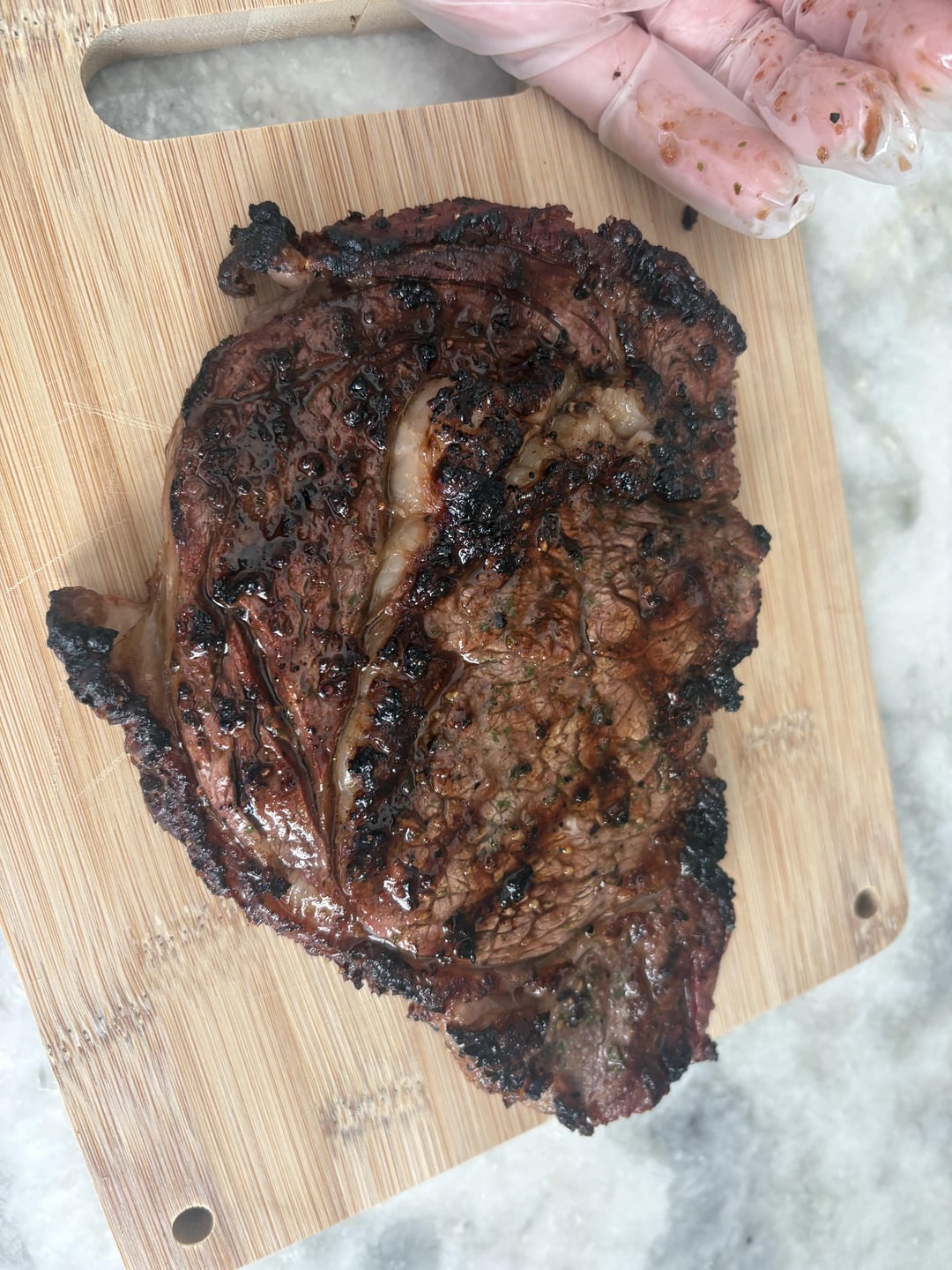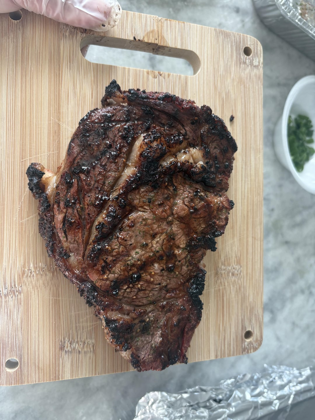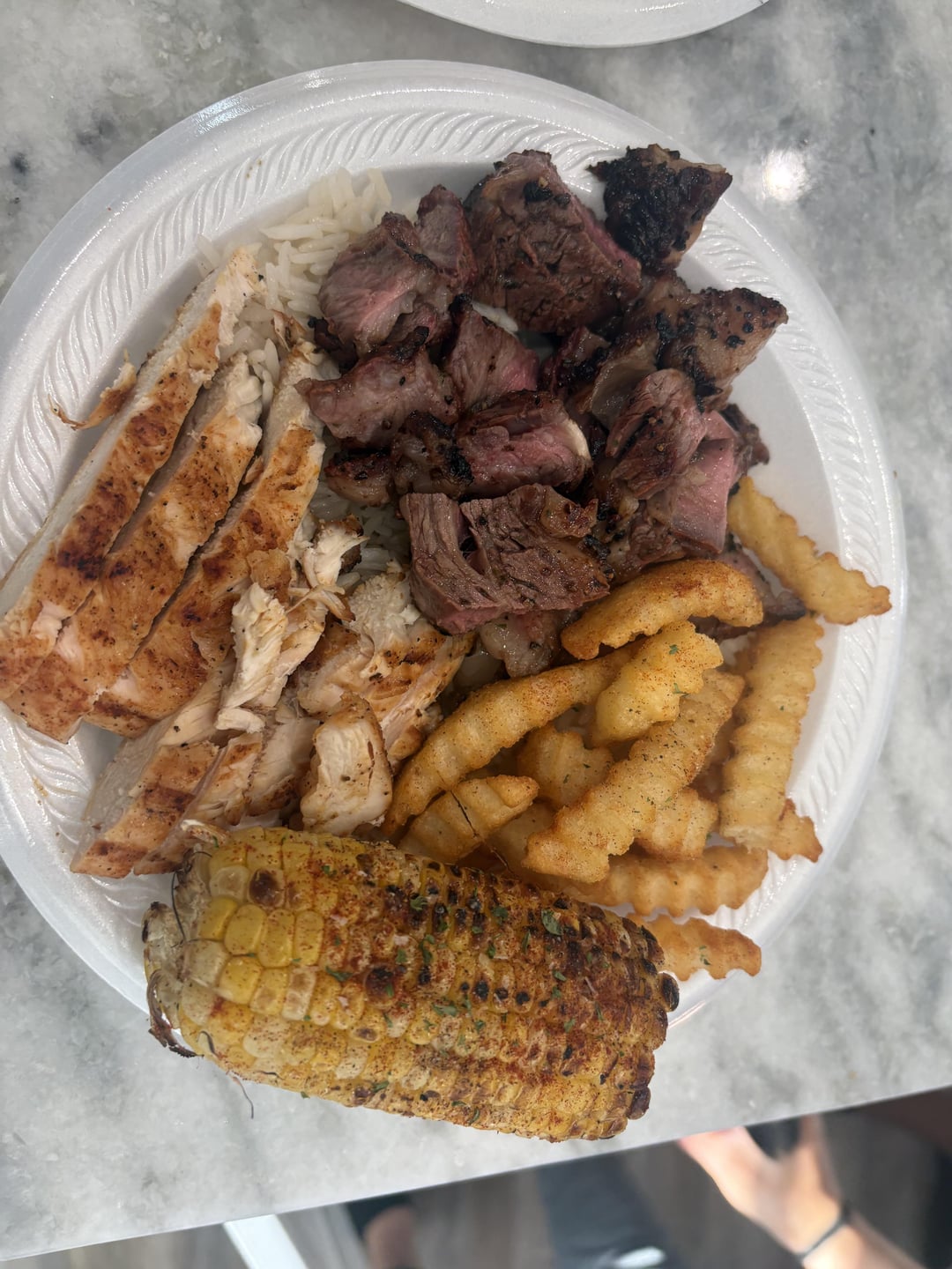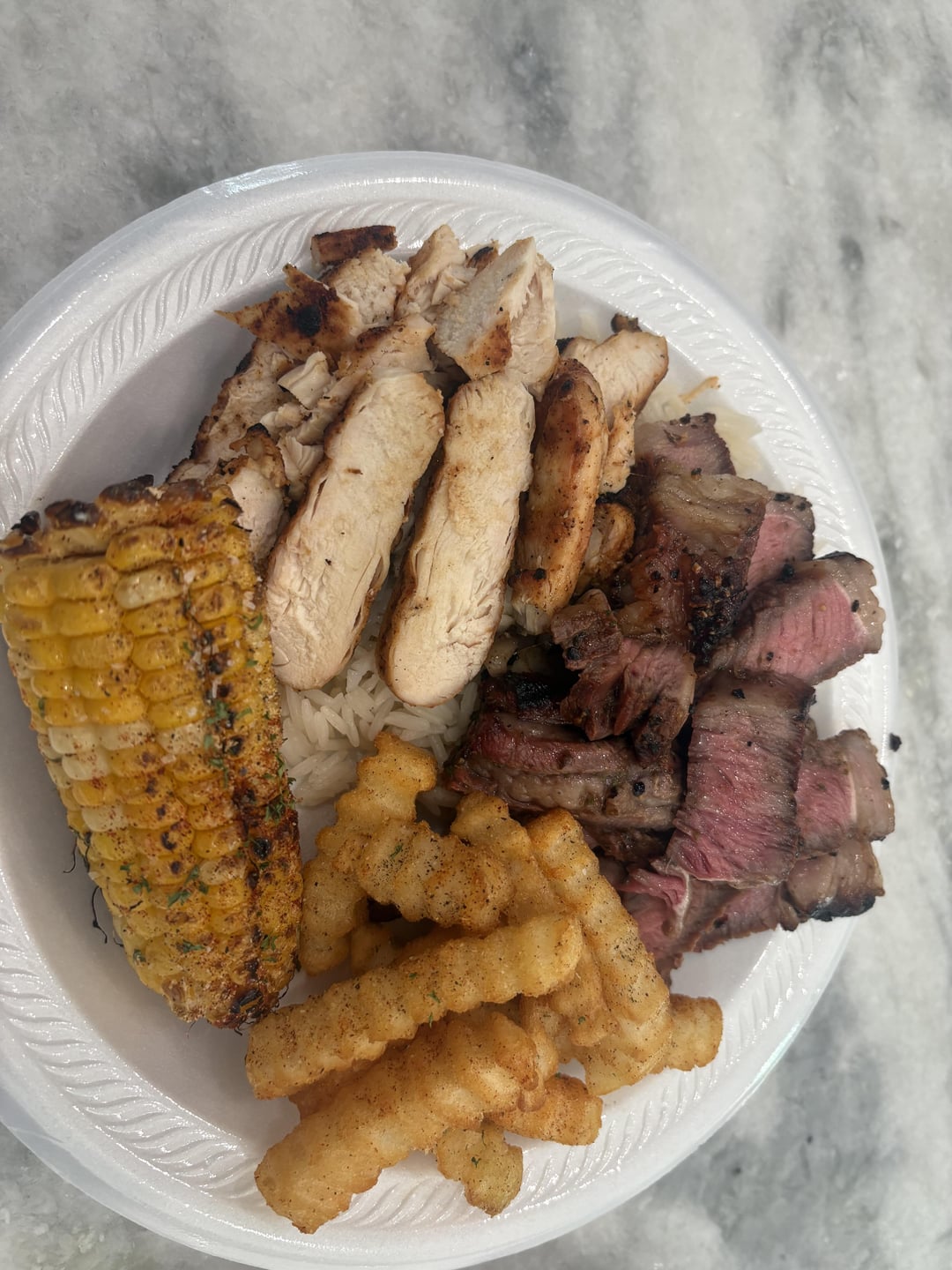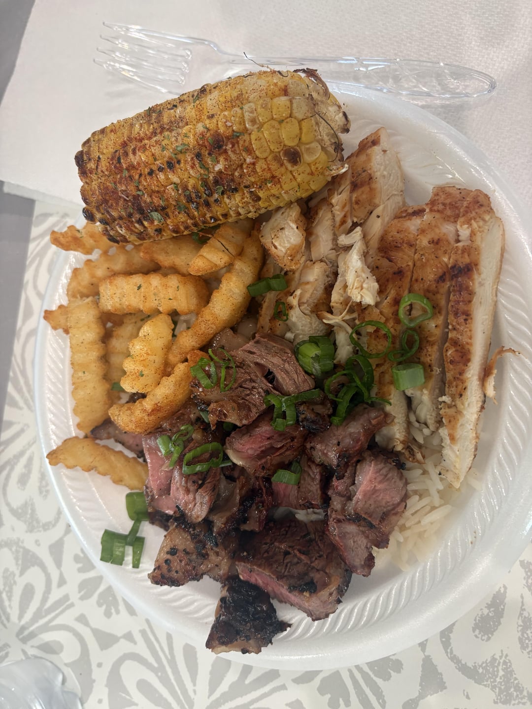Ribeye, chicken breast sliced up, corn, French fry taters in the air fryer. Over jasmine rice topped with green onions! Guac and green salsa on the side. I’m stuffed!