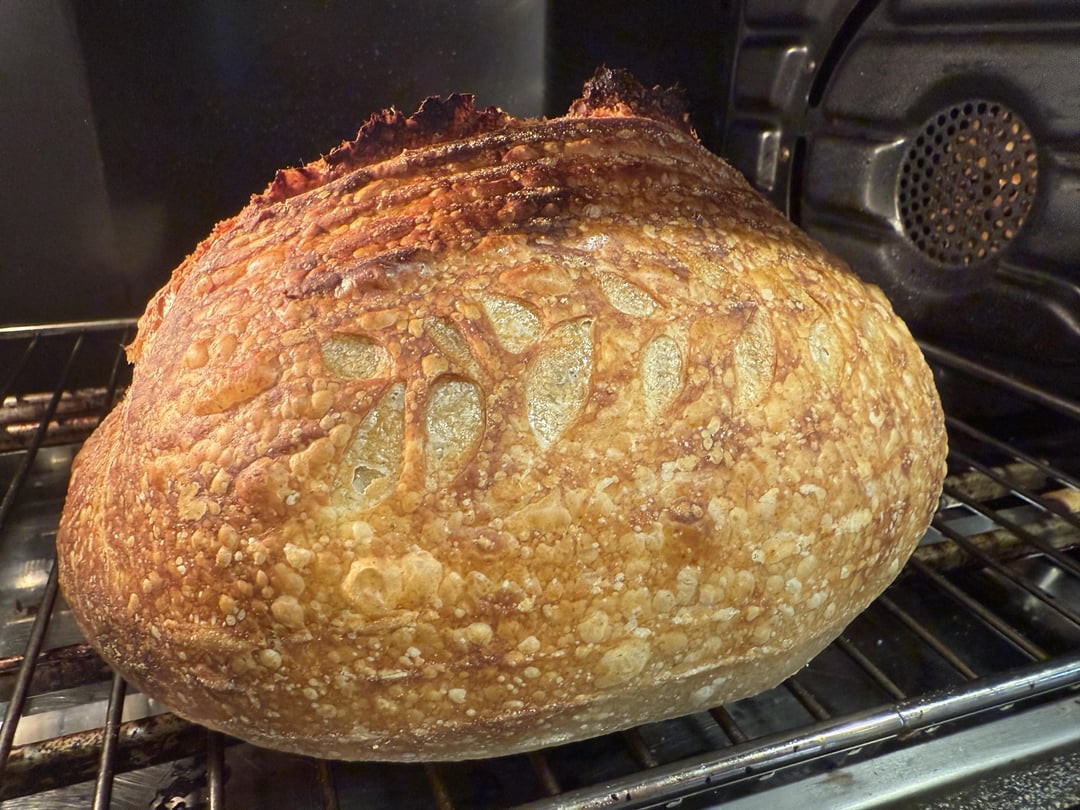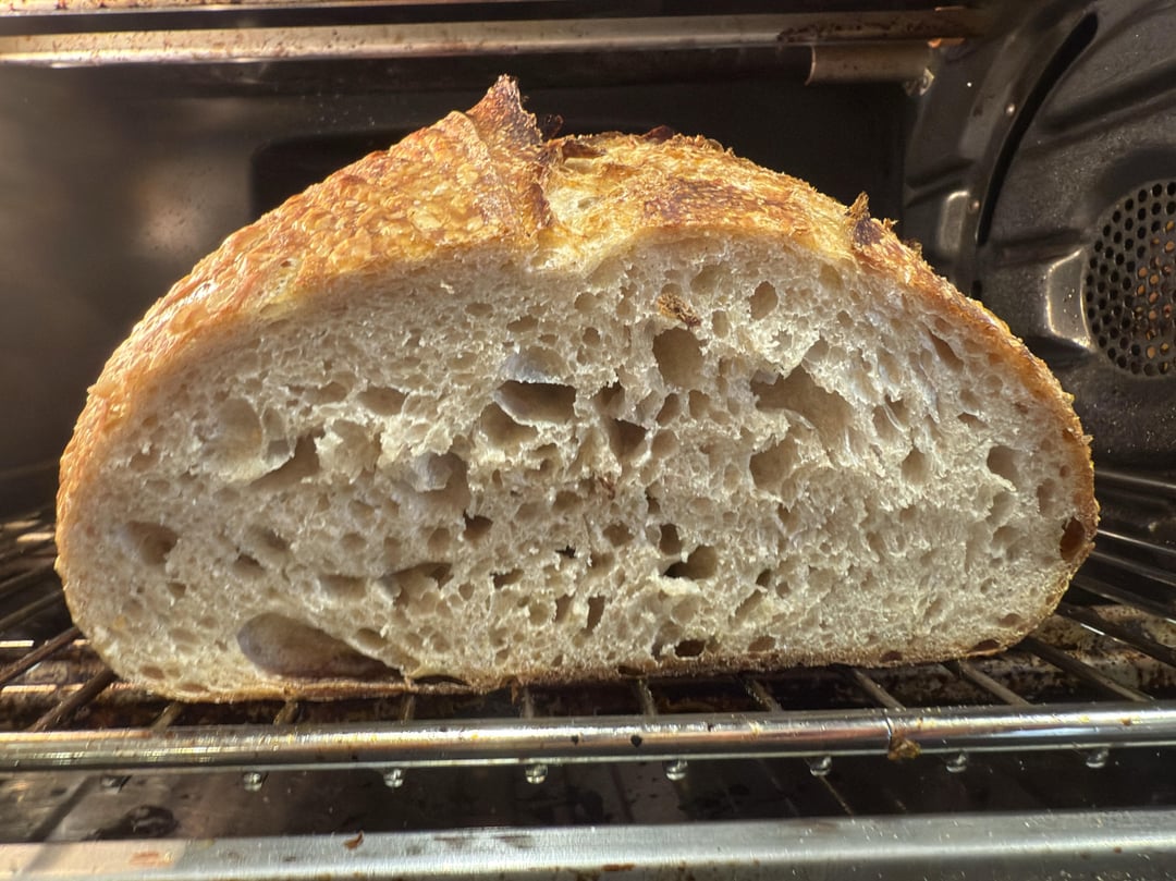 Thanks to u/suec76 for her solid recipe and ratios! 500g KAF Special Patent Flour, 325g water, 125g starter (developed with half KAF AP, half KAF rye), 10g salt. Combined water, flour, starter and let sit 20 minutes. Added in salt and worked dough for 10 min. 3 sets of stretch and folds in 30 min intervals, then let it sit untouched for the second half of bulk fermentation. I use a dough proofer so it only took 4 hours at 80 degrees. Preshape; sit 30 minutes, shape, then into the fridge for a 12 hour cold retard. Bake covered in preheated bread oven at 450F for 25 minutes, then uncovered for 20 at same temp. Cool for 3 hours before cutting. Tasty with a chewy crust!