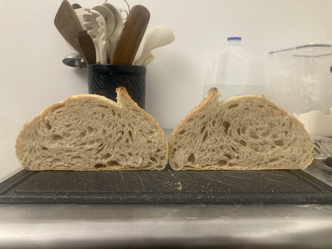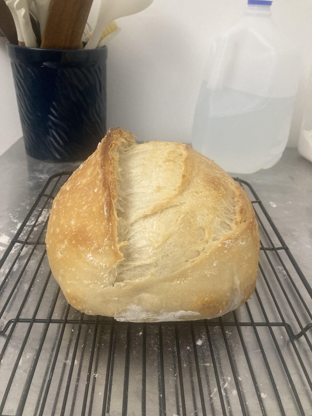 I’ve been going for the ear forever, and I finally got it! Definitely the nicest loaf I’ve made so far. It was really all about creating tension. I did one cut a half inch deep, and then I did an extra cut to make a bit of a flap. I also put two ice cubes in the Dutch oven.