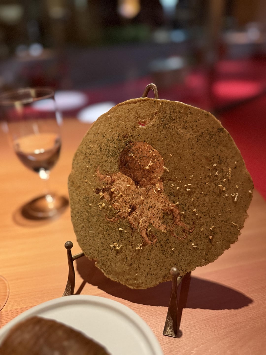 Cracker with fried anchovy heads and a tiny octopus pressed.