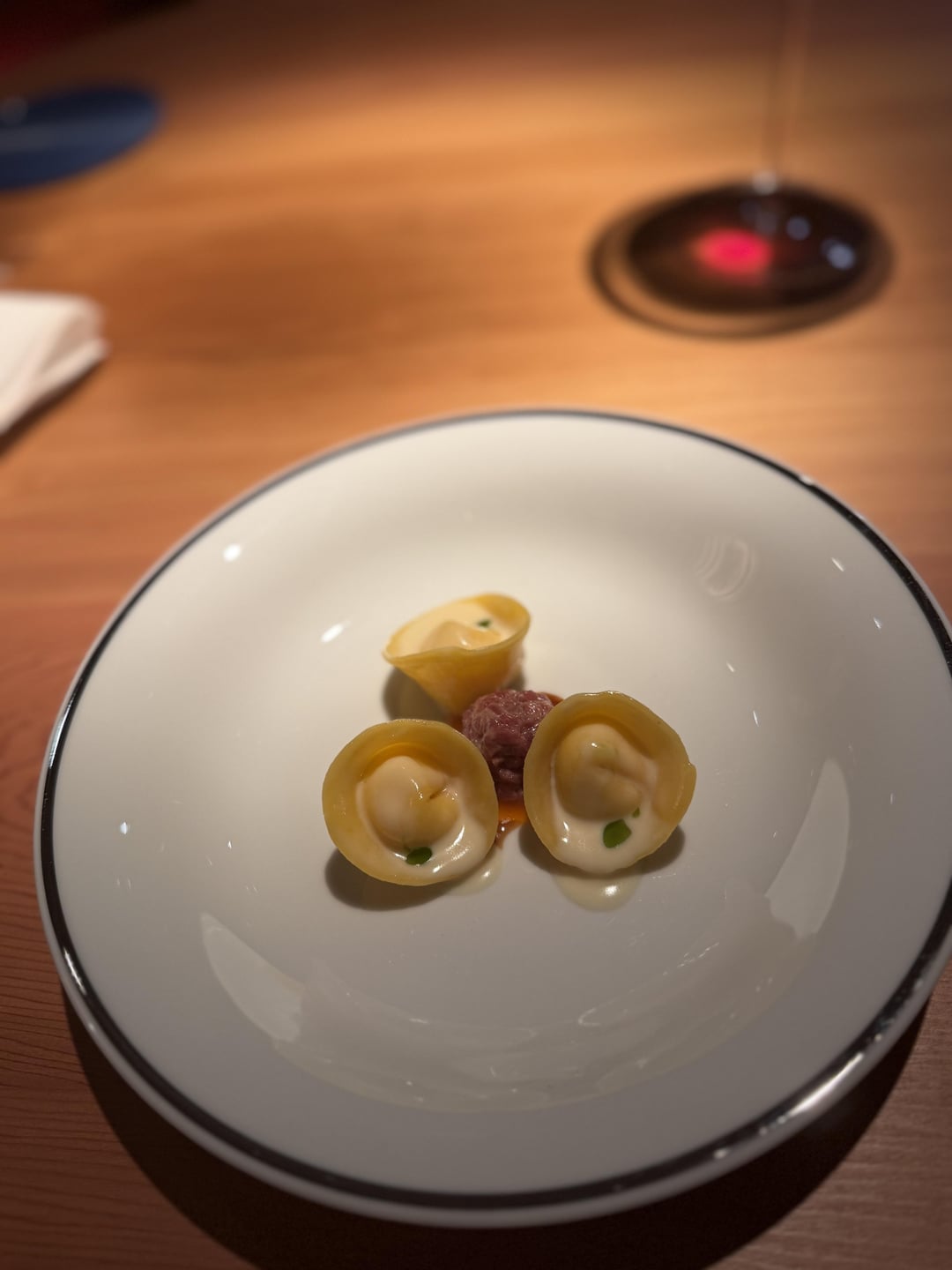 Reverse tortellini. Bursting with liquid Parmesan and accompanied with beef tartare.