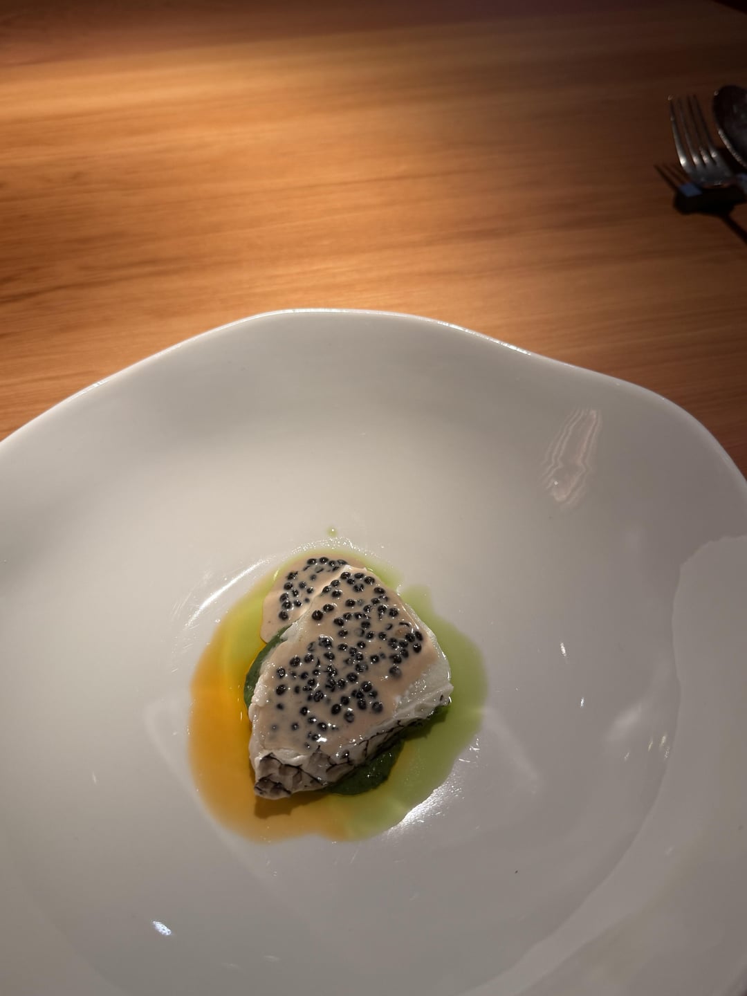 Chilean sea bass in a bone sauce with caviar, sorrel and kimchi oil.