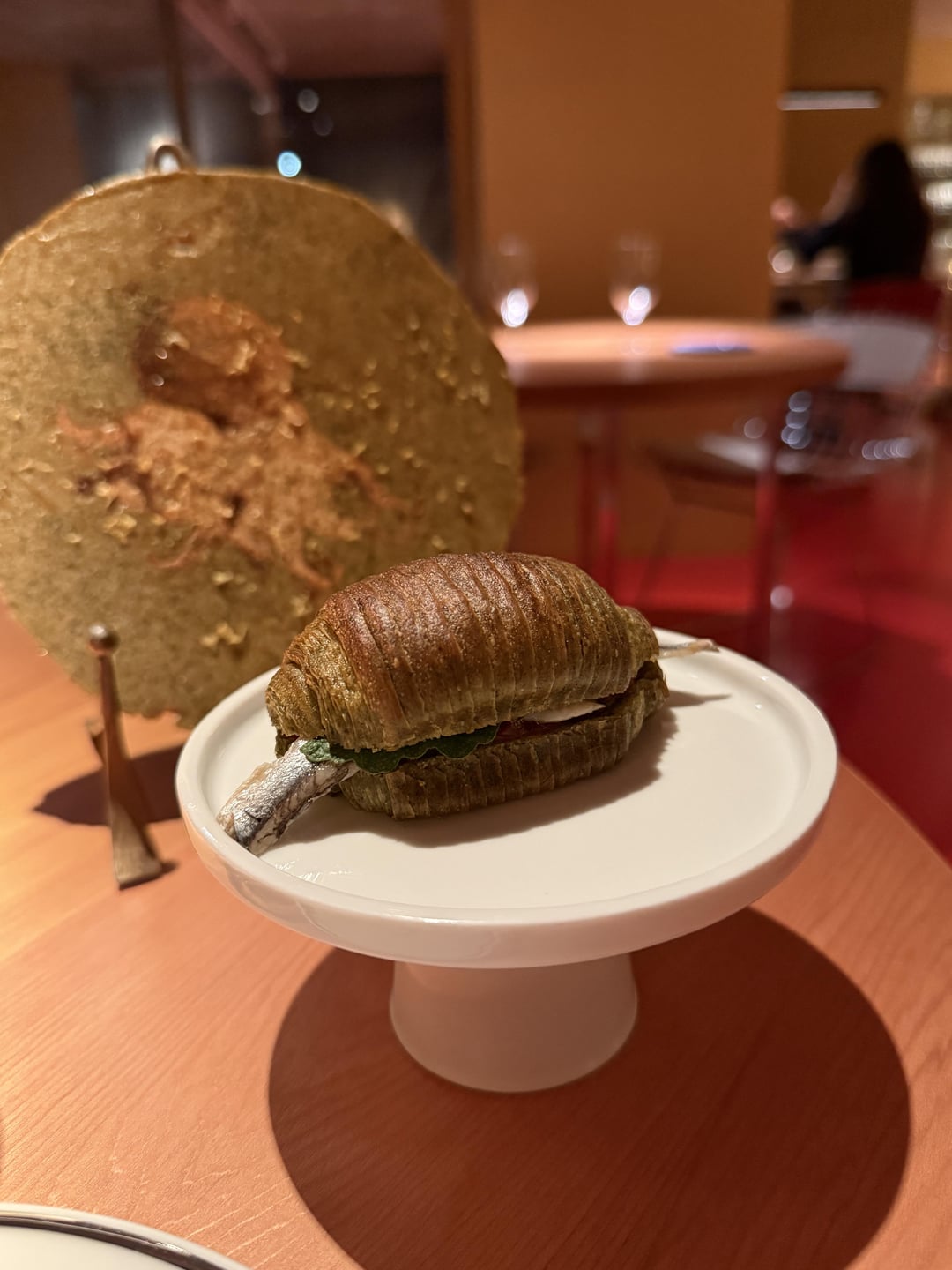 Seaweed croissant with marinated anchovies, okra and fermented ginger and carrots.