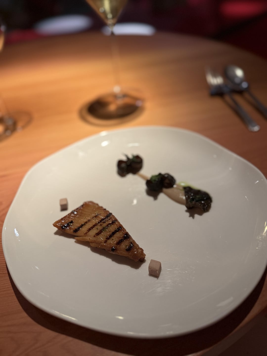Charcoal grilled ray with wood ear mushroom and mushroom purée and almond tofu.