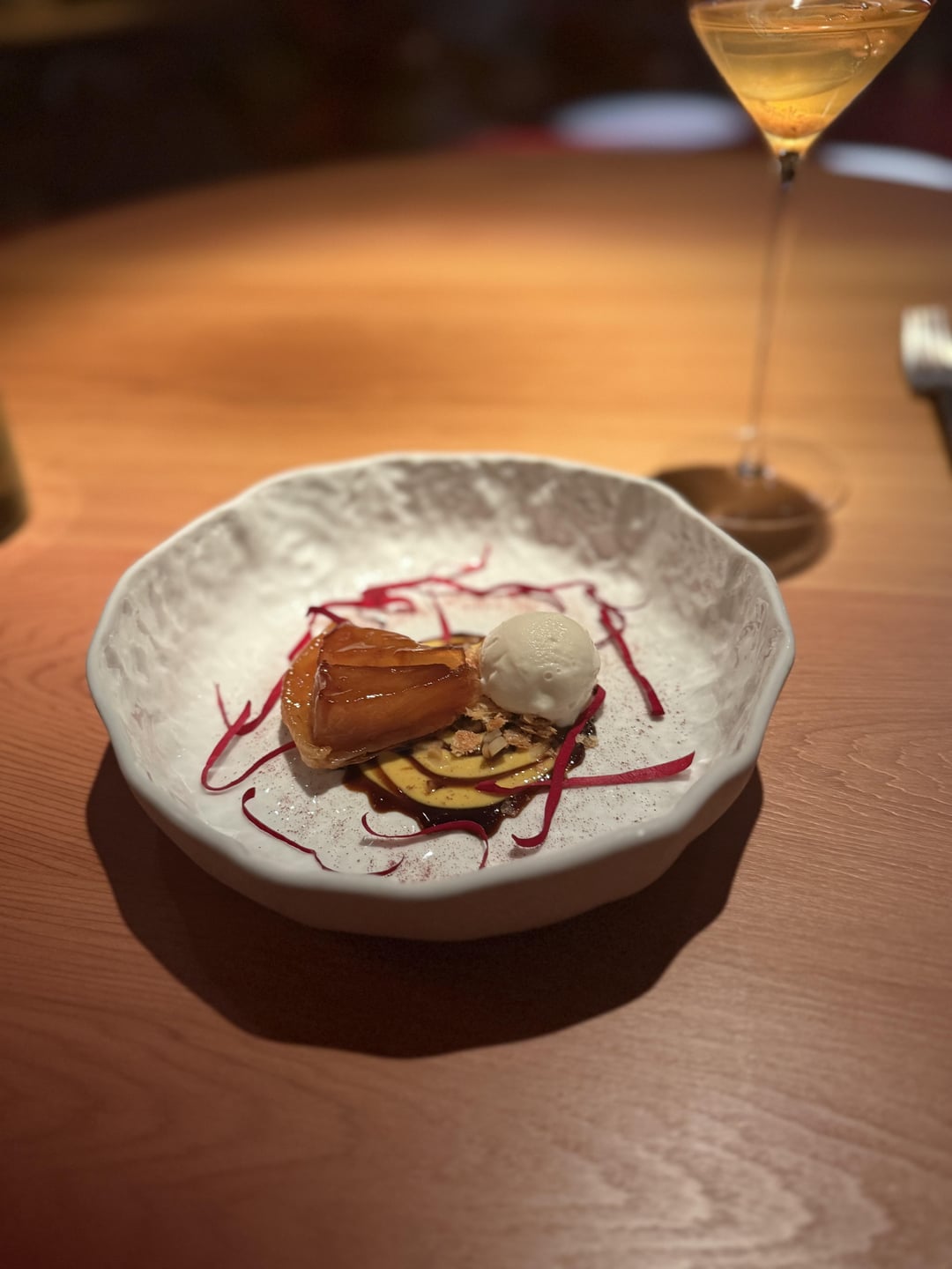 Celeriac tarte tatin with rose ice cream, vanilla sauce and balsamic vinegar jam.