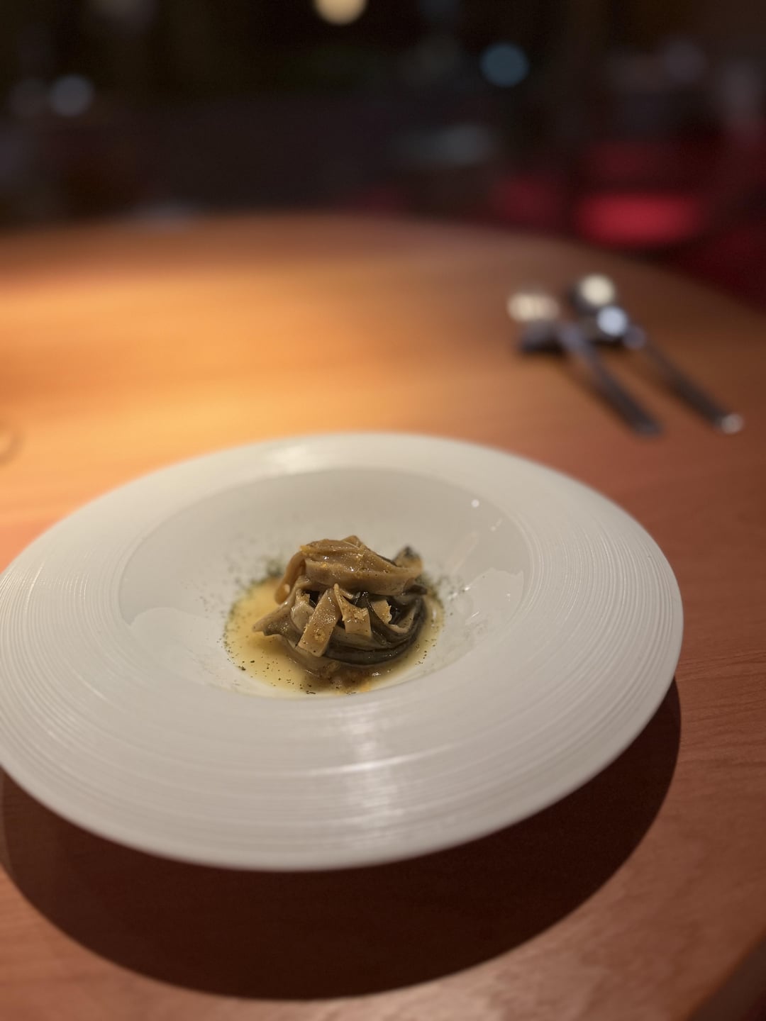 Smoked pasta with turbot bones and seaweed spaghetti, sour butter and anchovies sauce.