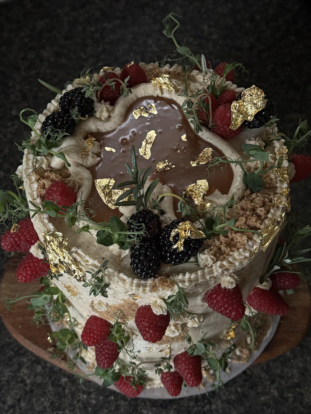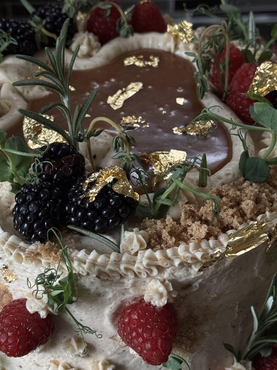 Decorated with rosemary, thyme, pea shoots, raspberries, blackberries, scratch graham, and gold.