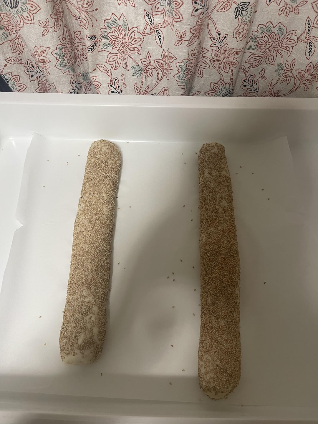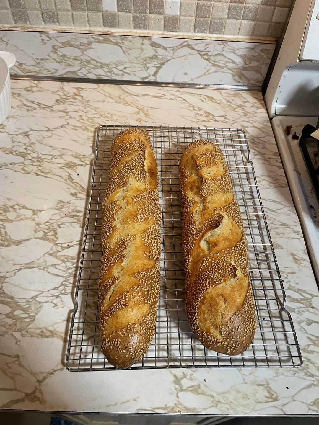 Combine and knead for 10 minutes then let bulk ferment for 2 hours. Then divide into two 425g balls and pop in the fridge for at least 24 hours. When you are going to bake, take the dough ball out of the fridge and let it rest at room temp for about 90 minutes. Then shape into a roll and roll in sesame seeds if you want. Bake on a pizza stone preheated to 550°F and spray with water every three minutes for 15 – 20 minutes.