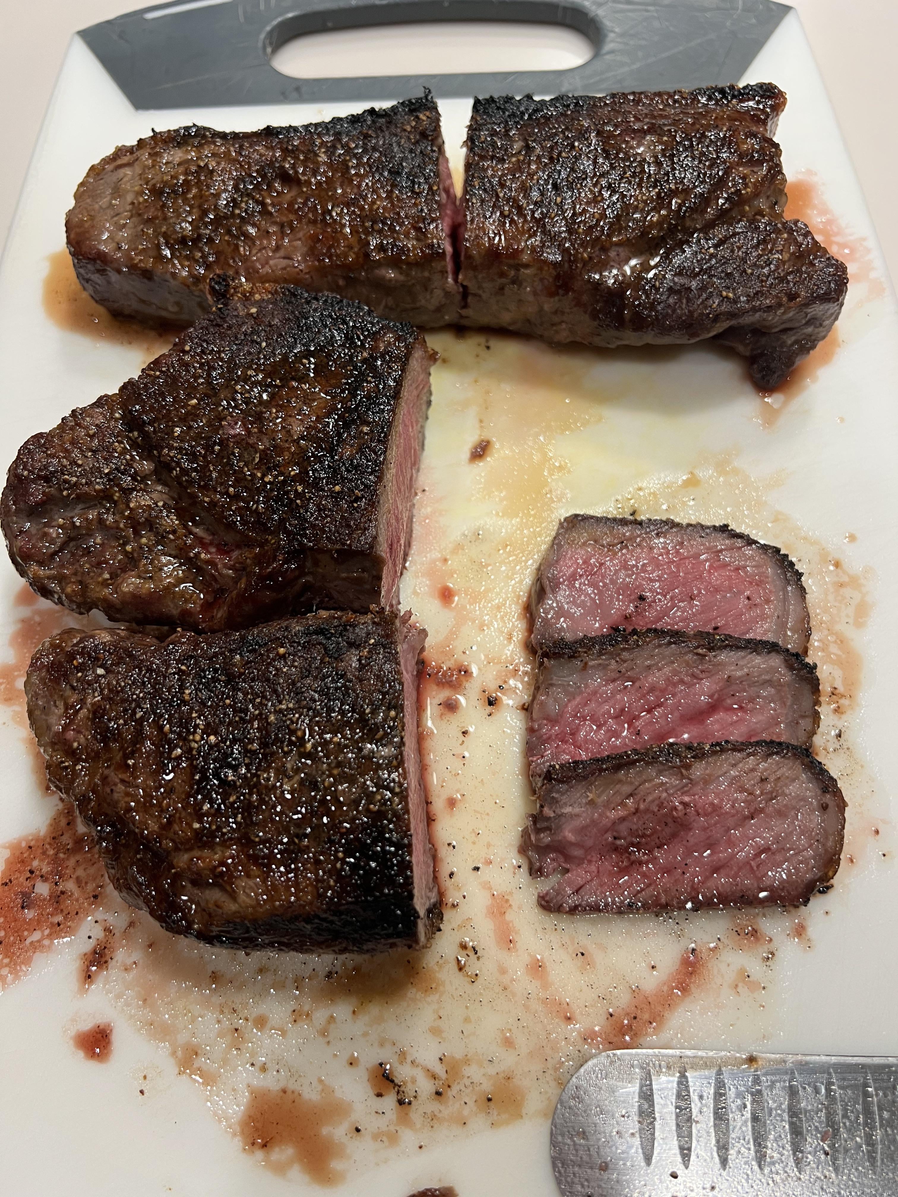 Salt and pepper. On the blazing bull infrared steak oven. Pull between 105-110. Core temp climbs to 125-130 after rest easily with such high surface tempsby blumpsicle Write A CommentYou must be logged in to post a comment.