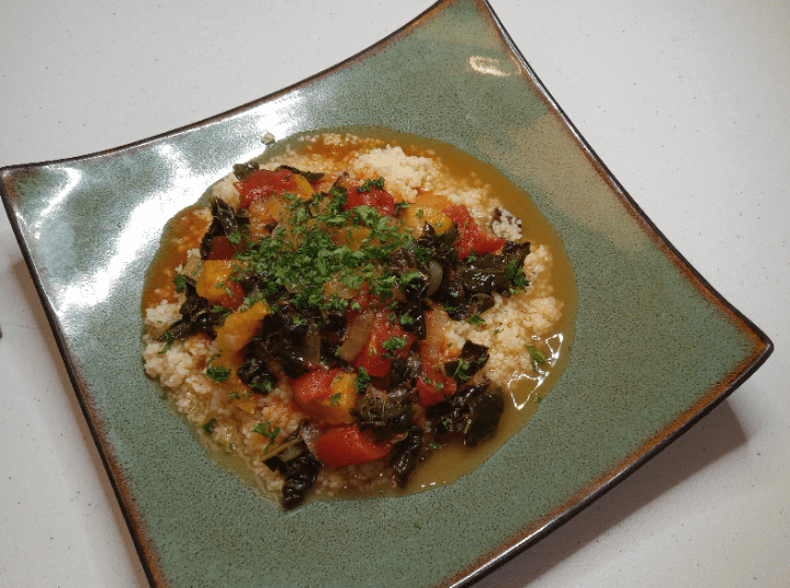 For the sauce, a small onion, sauteed, added 1 cu water with 1/2 bullion cube, some chopped kale, 1/2 can diced tomatos, 2 or 3 dried apricots diced, 1/4 tsp sugar, pinch garlic salt, simmered 90 minutes.
