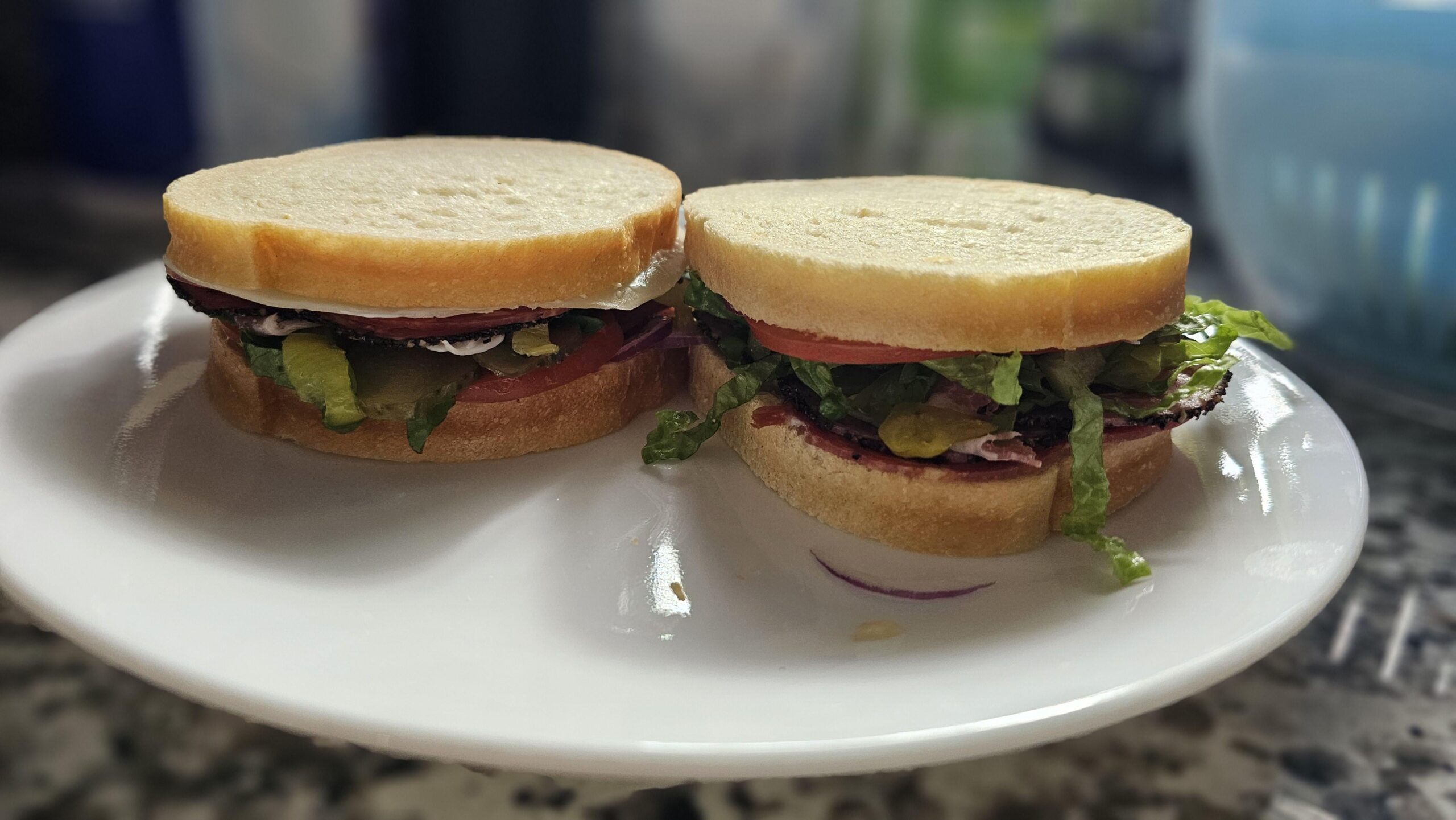 Made two very similar sandwiches. Sourdough bread, salami, pepperoni, tomatoes, onions, lettuce, banana peppers, oil, mustard, mayo. One has provolone and one does not, I ran out.