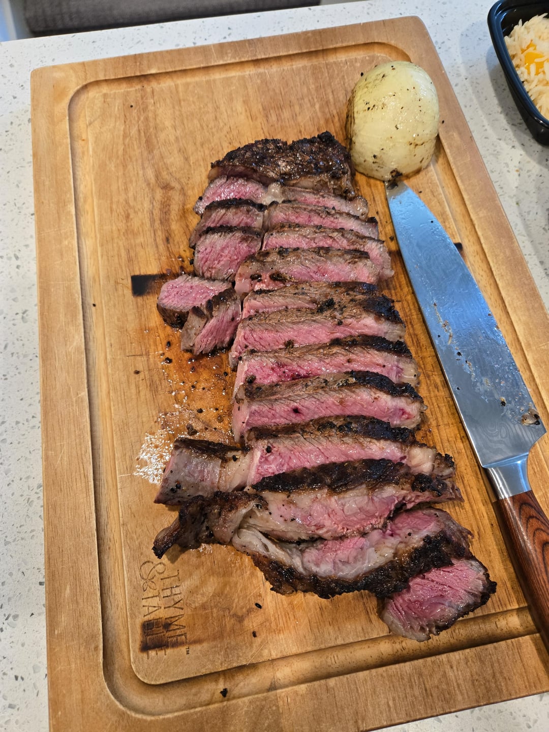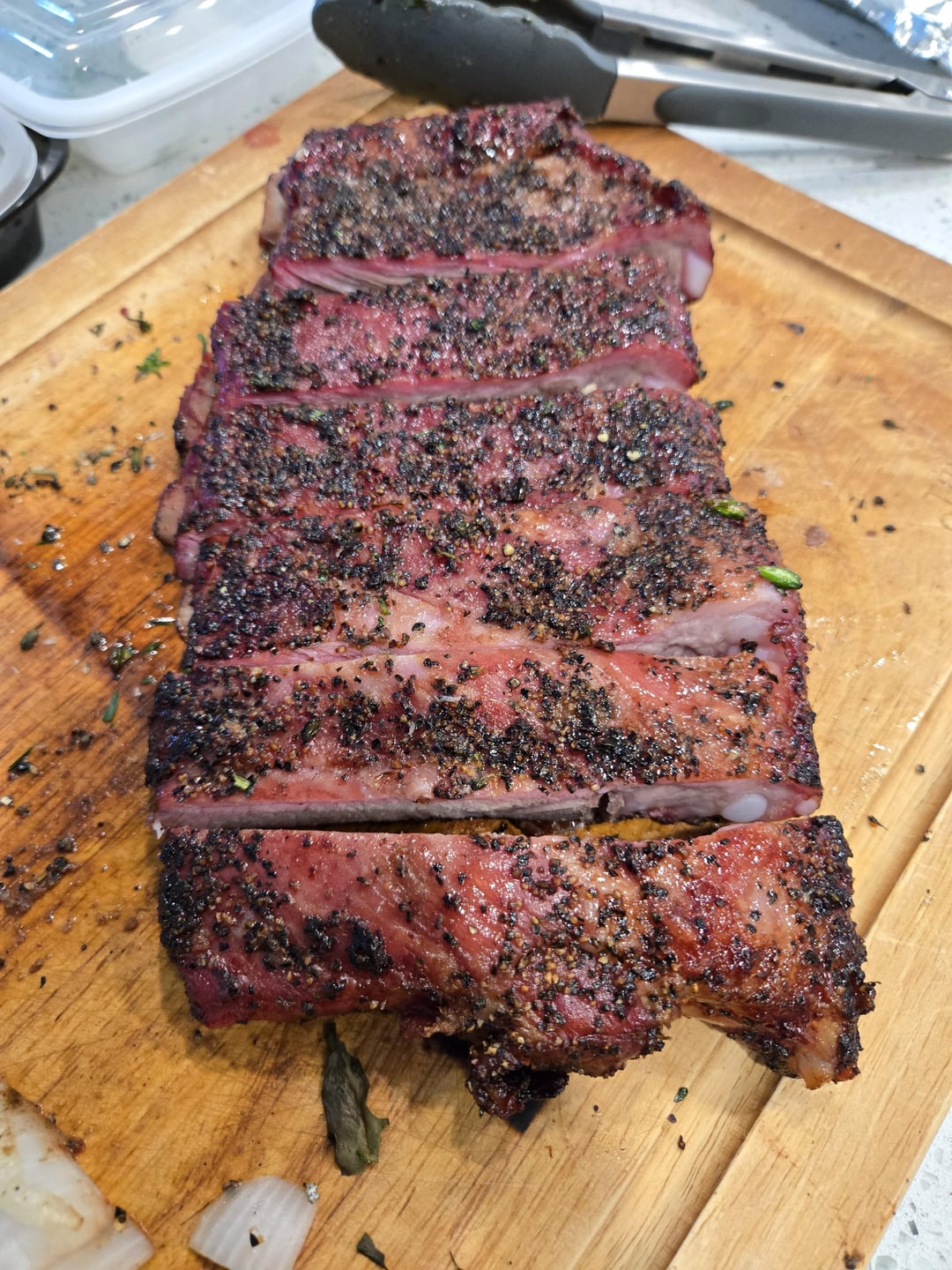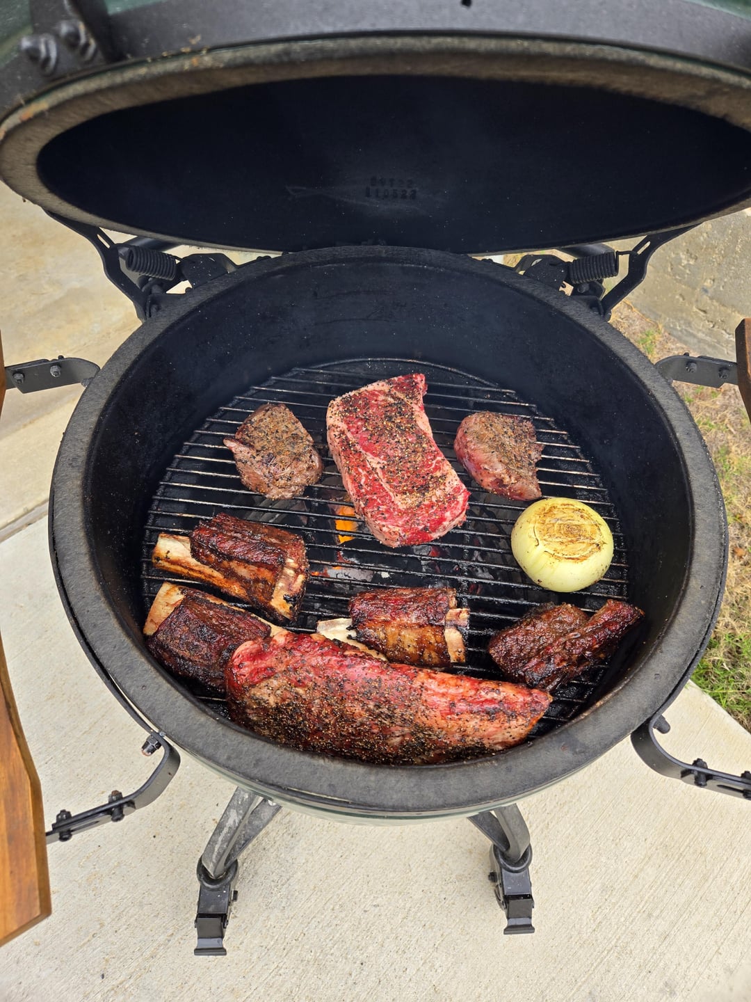Ribeye, sirloin, beef ribs, pork ribs and an onion all on the Large BGE.