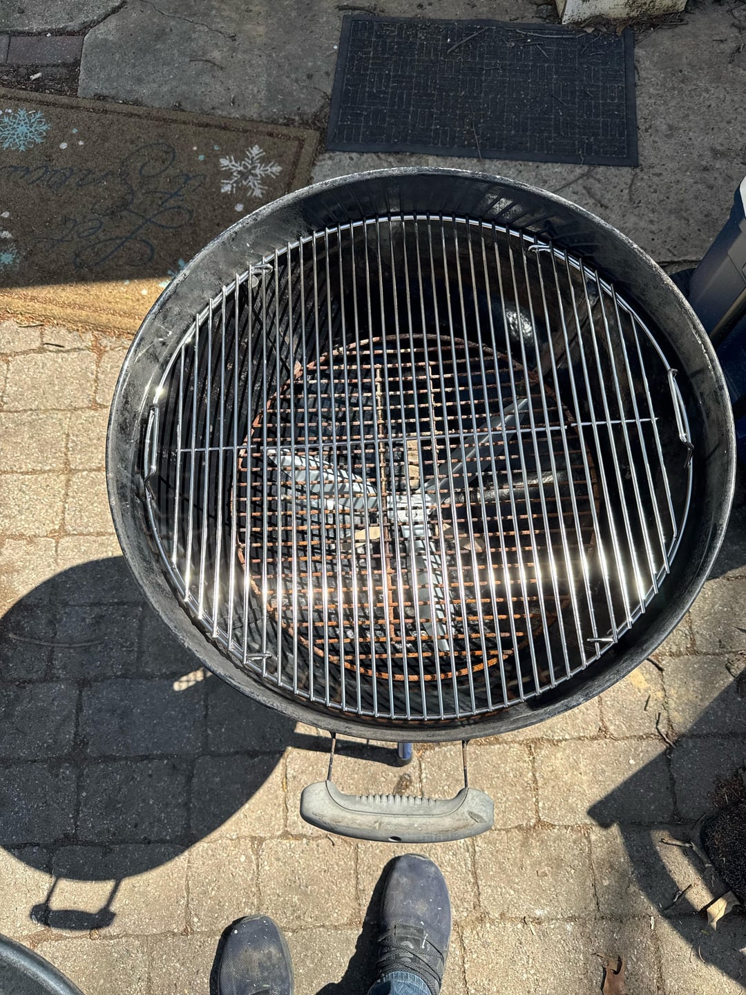 Interesting that it has an old school ash catcher on a new style kettle. I personally like the old school ash catcher, I just wrap mine in aluminum foil to keep it clean. The grates look new, good call