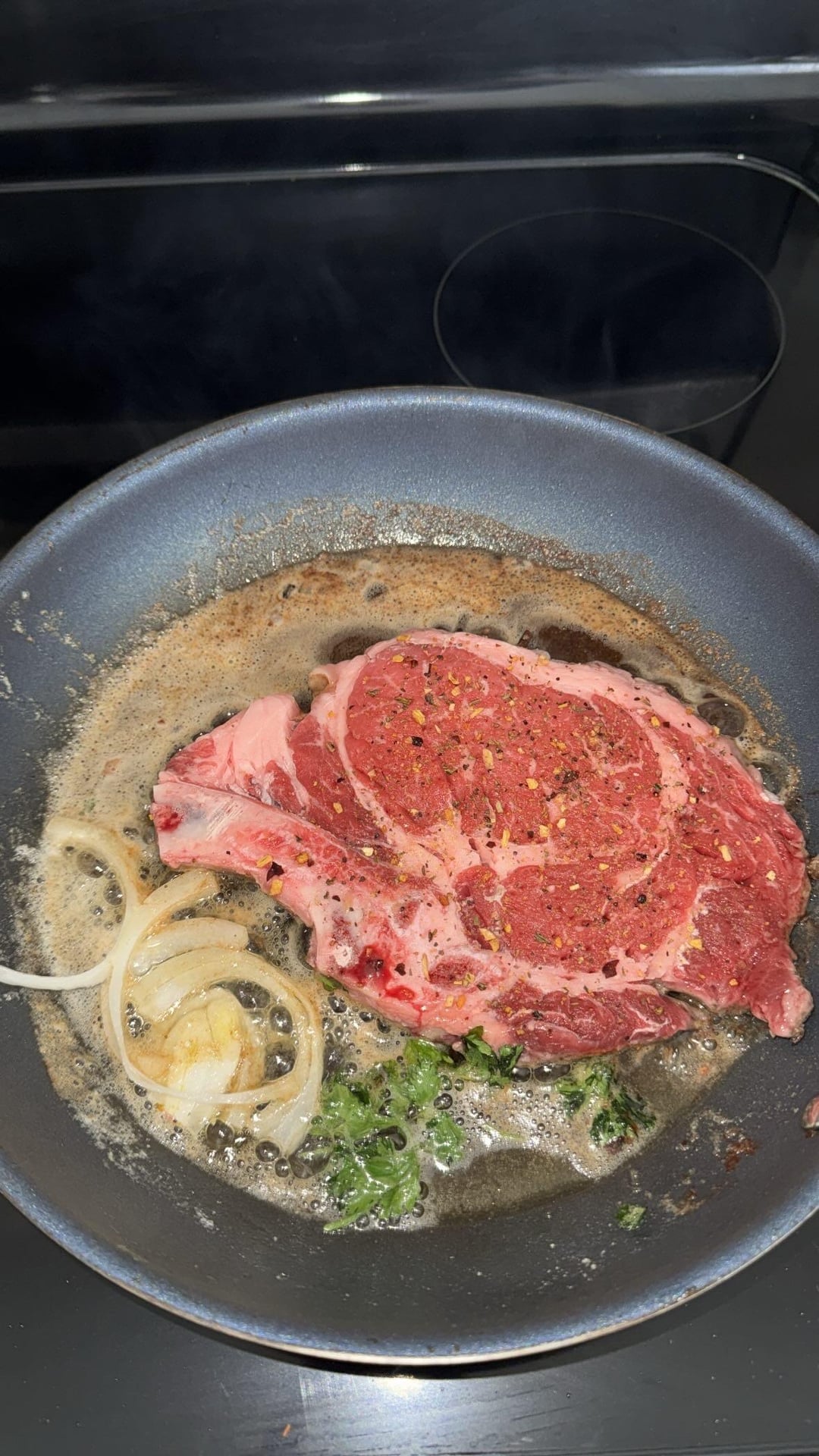 Put the butter in at the end after the steak is seared with oil because butter milk solids have a lower burning point and its going to taste burnt.