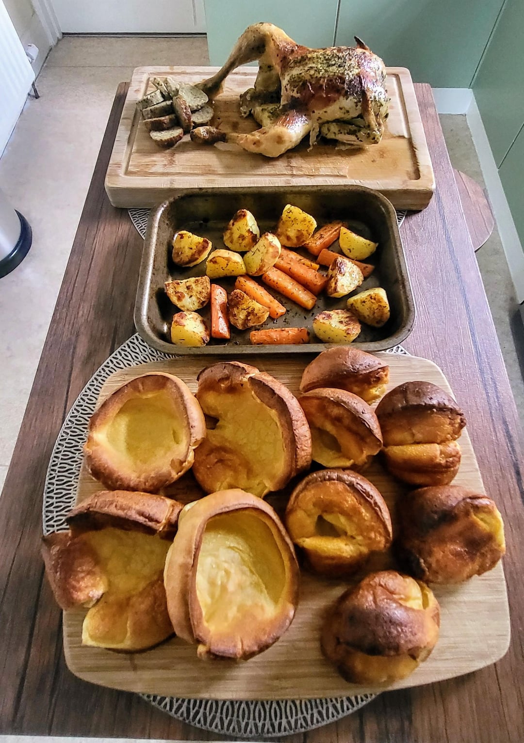 Roast chicken dinner with stuffing, Yorkies, mashed potato (unpeeled sweet & white), roasted potatoes & carrots, red cabbage and broccoli, all smothered with a lovely gravy (made with the chicken juices). I had a Brewgooder APA (5% abv) with mine, too…