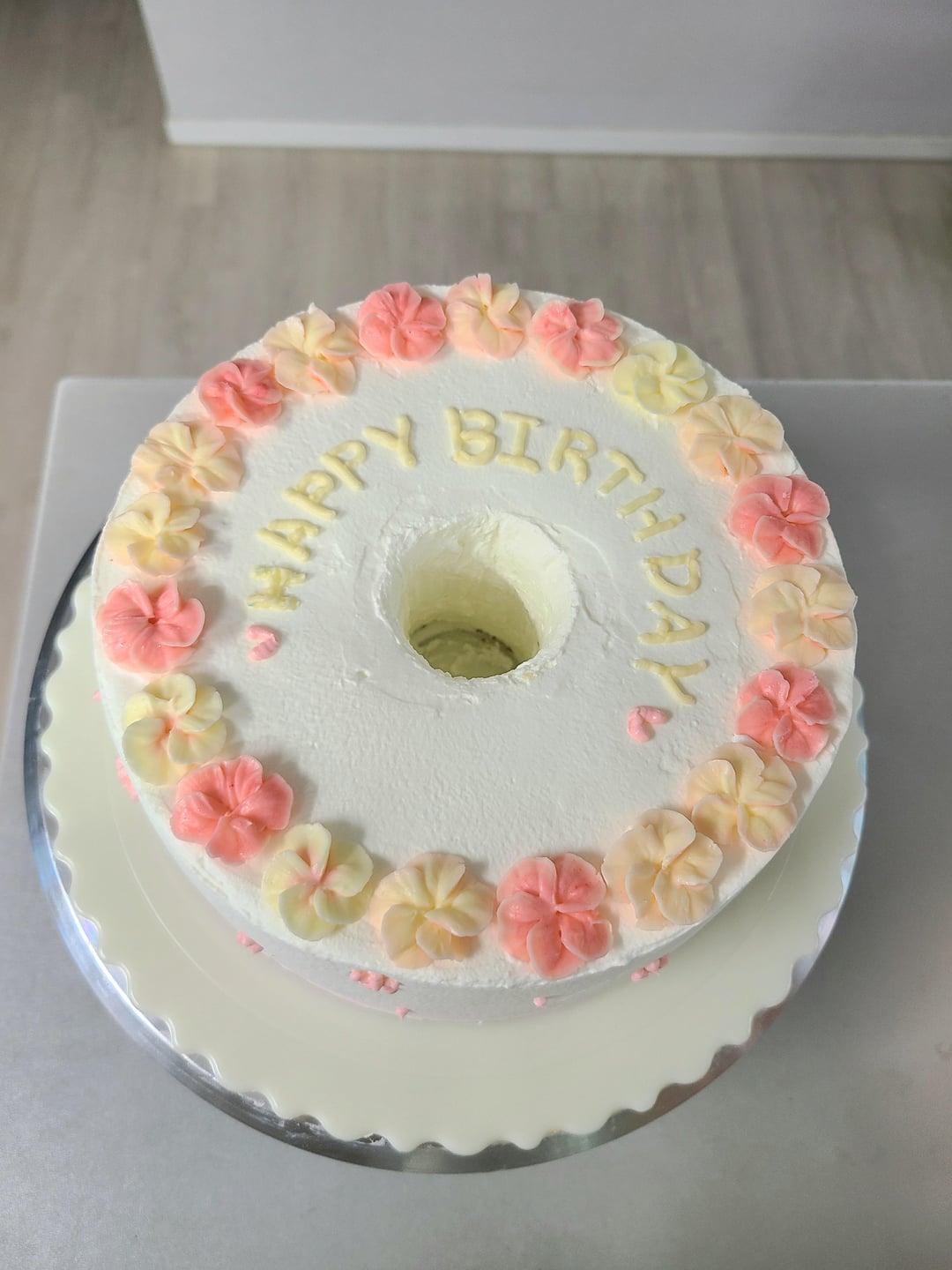 Icing a chiffon cake is the trickiest part, especially around the hole in the middle, so I kind of messed it up a little.