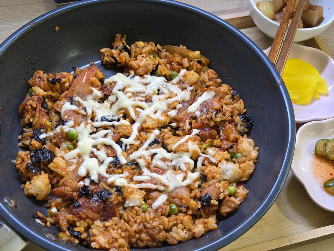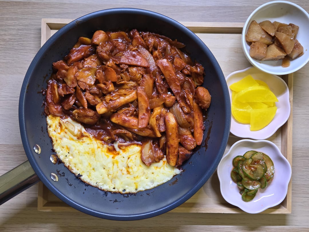 Dakgalbi contained chicken thighs, carrot, cabbage, onion, and some tteok. Served with melted mozzarella and banchan I made on the weekend (gamja jorim, oi muchin, danmuji was storebought lol).