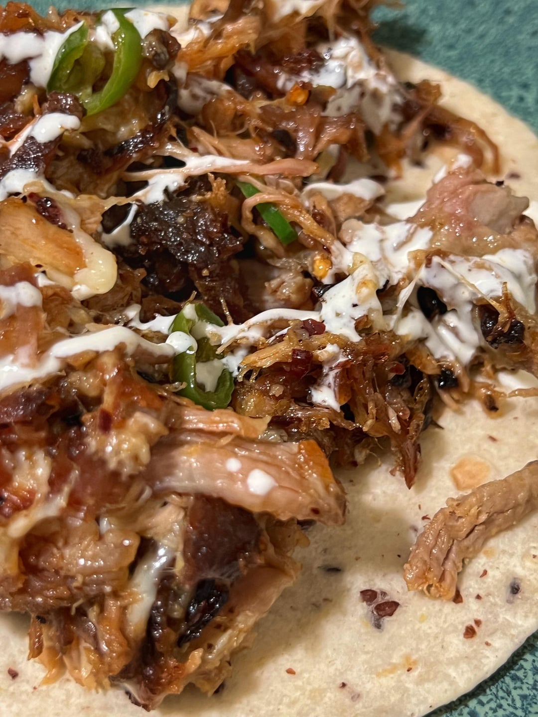 Last of my left over pork fried with chili oil, Serrano chilies, cilantro then tossed with diced tomatoes and onion. Finally tossed with lots of cheese and wrapped in my Nutricas tortillas from Guerrero. Finally drizzled with crema.by GiantChef1 Write A CommentYou must be logged in to post a comment.