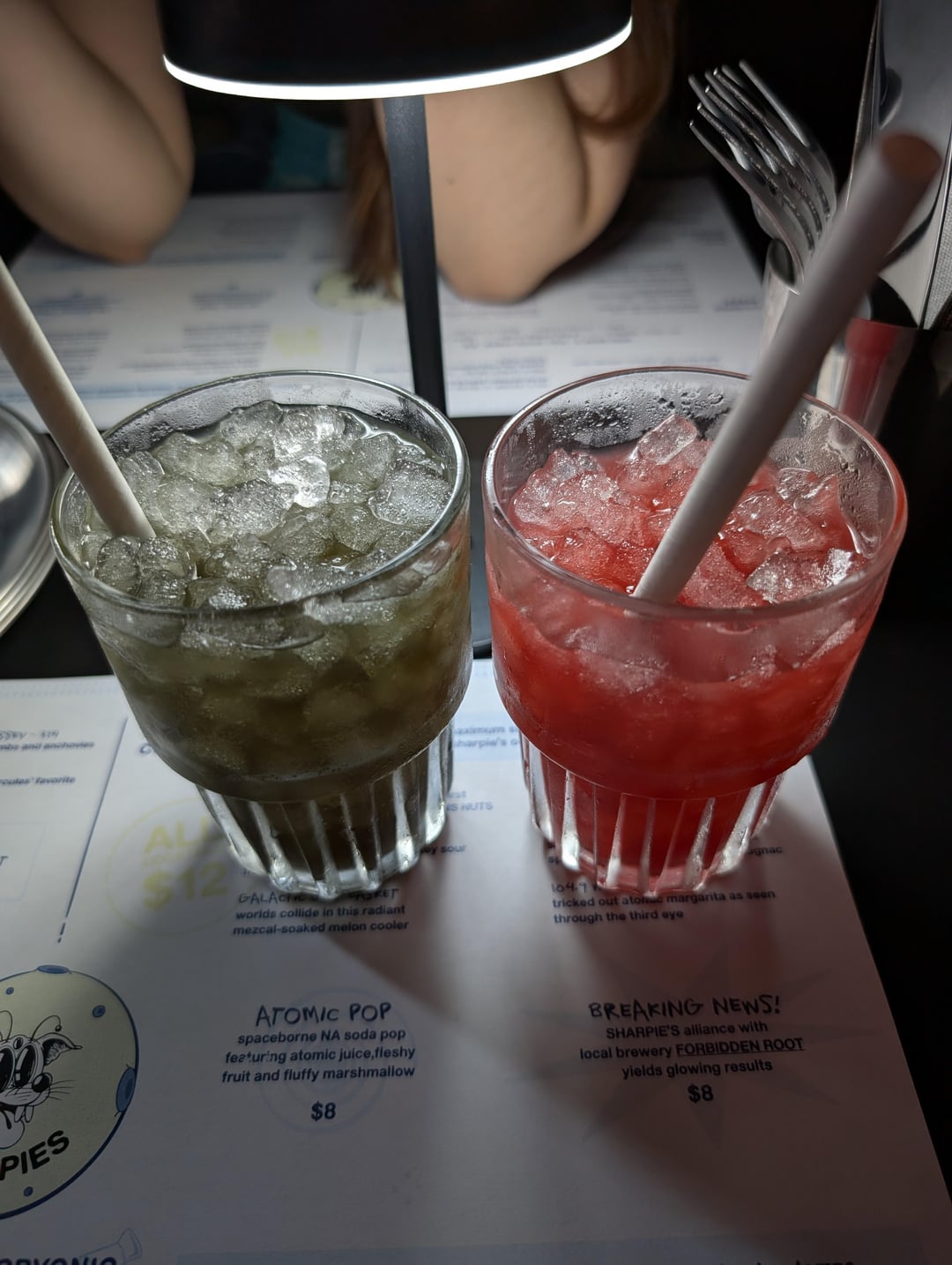 The drinks at Sharpies are split into two categories. Light mixes all served over crushed ice and stronger traditional cocktails. Pictured are the Crunch-Time and the Sharpies Hotrod, a riff on a mai tai and a whiskey sour respectively, both in the first category. Unfortunately I found both of these rather saccharine and syrupy, but the colors were fun.