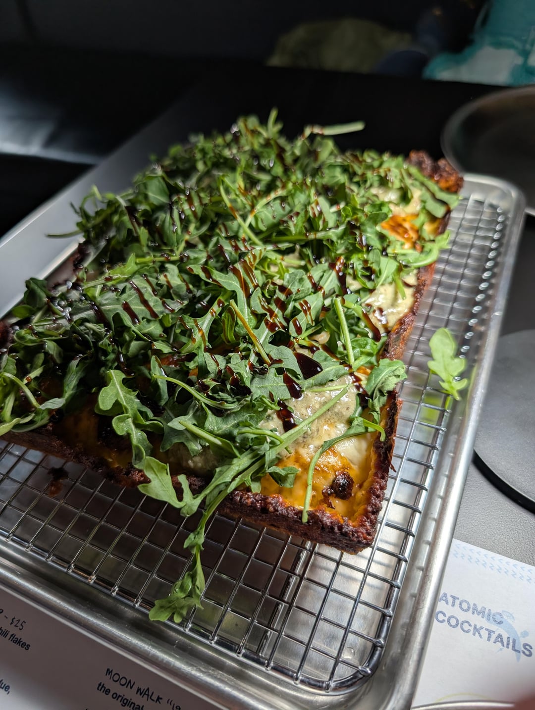 We got the P.E.S.T.O. (the menu does not indicate what the acronym stands for) but it has pesto, arugula, and balsamic. The edges of the crust shatter like glass, the dough is fluffy with enough chew to not be cakey. The peppery arugula, despite visually dominating the pizza, is needed to cut through the richness of the oil in the pesto and the cheese. It is the best Detroit style I've had in the city without question (I found Fat Chris' quite disappointing last time I had it).