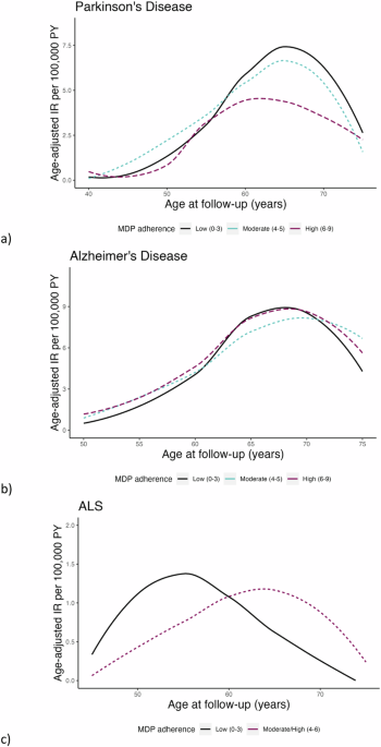 Age-adjusted incidence rates (IR) were calculated for PD, AD, and ALS separately, standardized using the distribution of attained age during the follow-up of the entire cohort. Additionally, age-adjusted IR for PD, AD, and ALS were calculated in 5-year age intervals by MDP adherence and visualized using a loess smoothing curve over age at follow-up. The association between MDP and PD, AD, and ALS was assessed using Cox regression models to estimate the hazard ratios (HRs) and 95% confidence intervals (95% CIs), using attained age (age at follow-up) as the underlying time scale. This MDP was evaluated as both a categorical (0–3 low, 4–5 moderate, 6–9 high) and continuous (0–9, per unit increase) variable. In a minimally adjusted model, we adjusted for year of birth, and in the fully adjusted model we additionally adjusted for BMI, education, physical activity, smoking status, history of diabetes and hypertension, and total energy intake as defined above. Natural cubic splines were fitted to assess the risk of PD, AD, and ALS across MDP score as a continuous variable (0–9), using an MDP score 4 as the reference. The proportional hazards assumption was assessed through the standardized Schoenfeld residuals for each outcome.