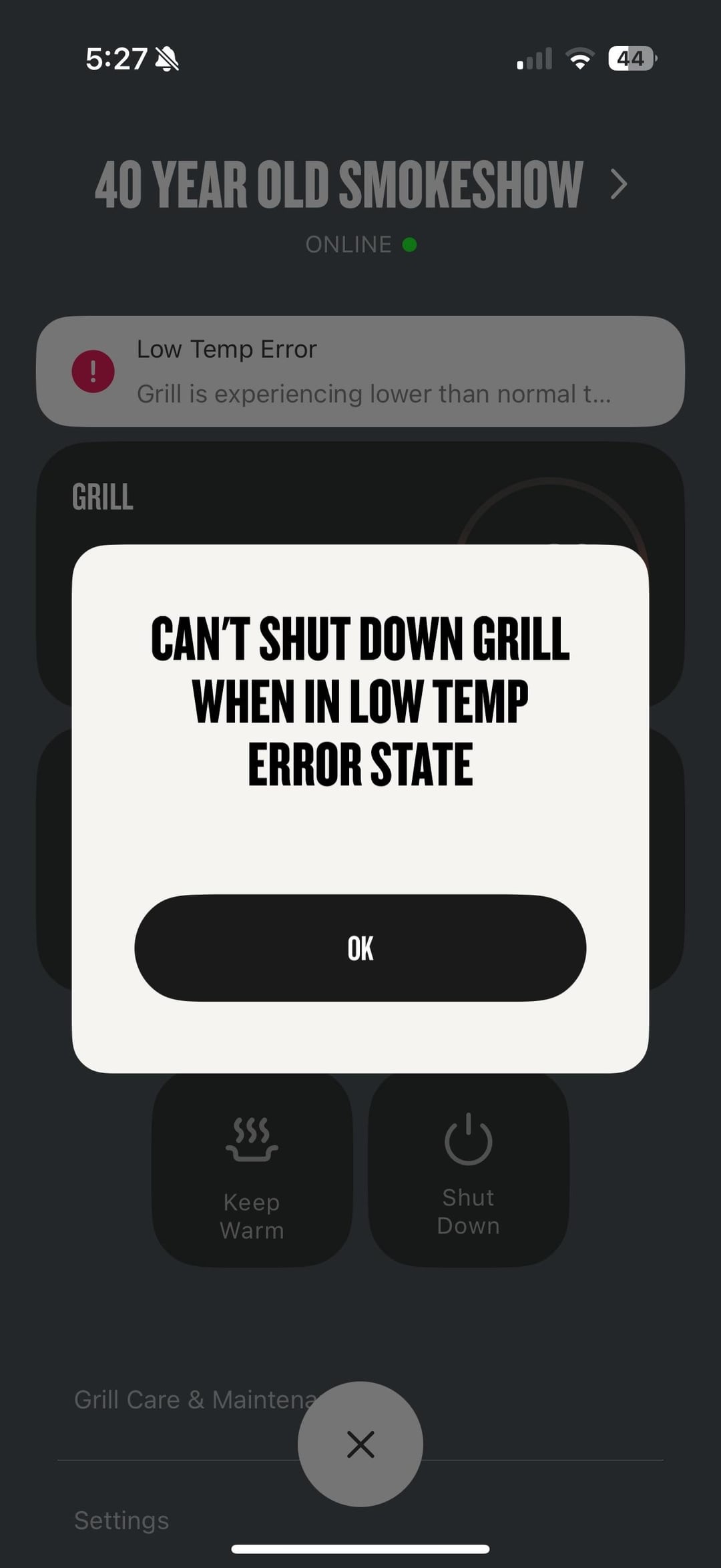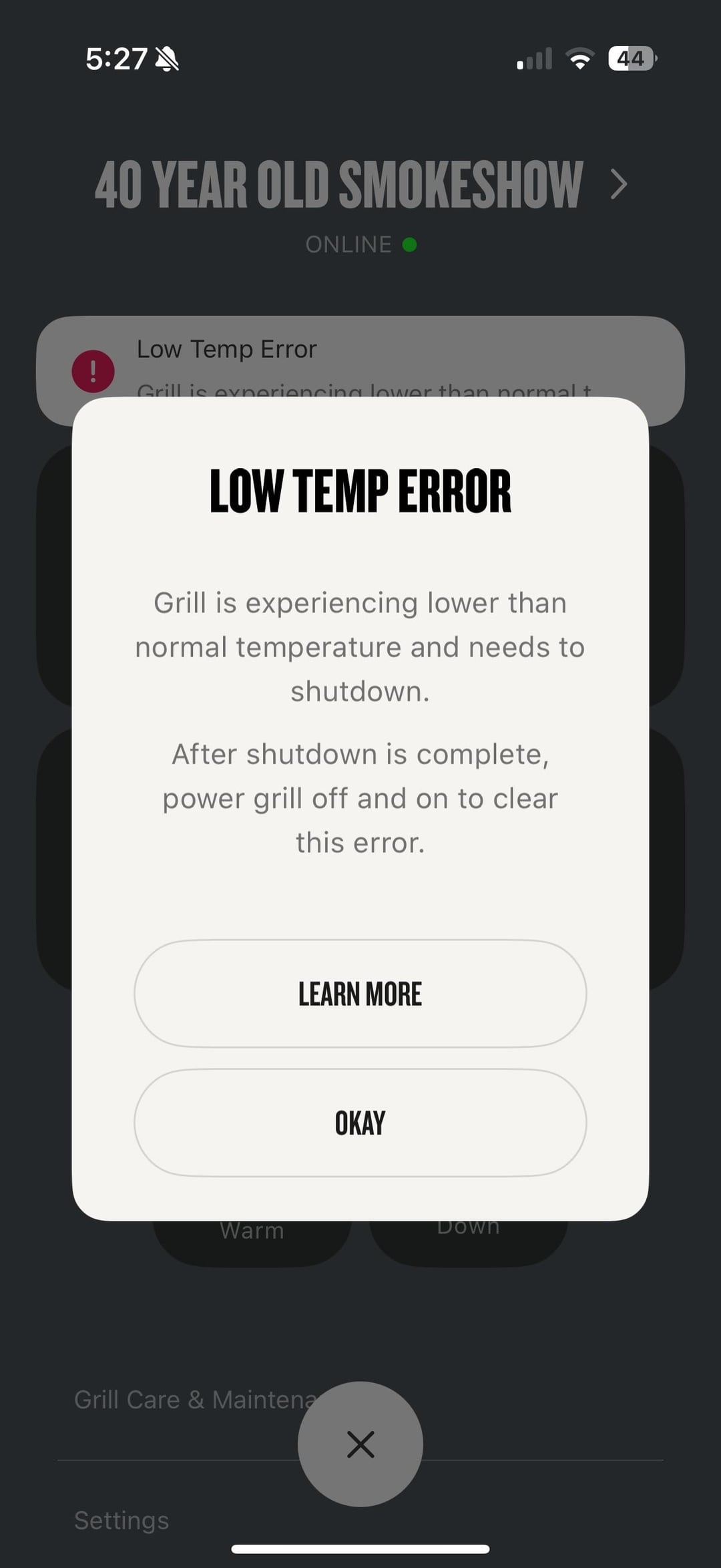 Accidentally left it running too long during a cook without checking the pellet level, resulting in a low temp error. Error message says I need to go through the shutdown process — so I try to start the shutdown process and get the message “can’t shutdown when in error state.”