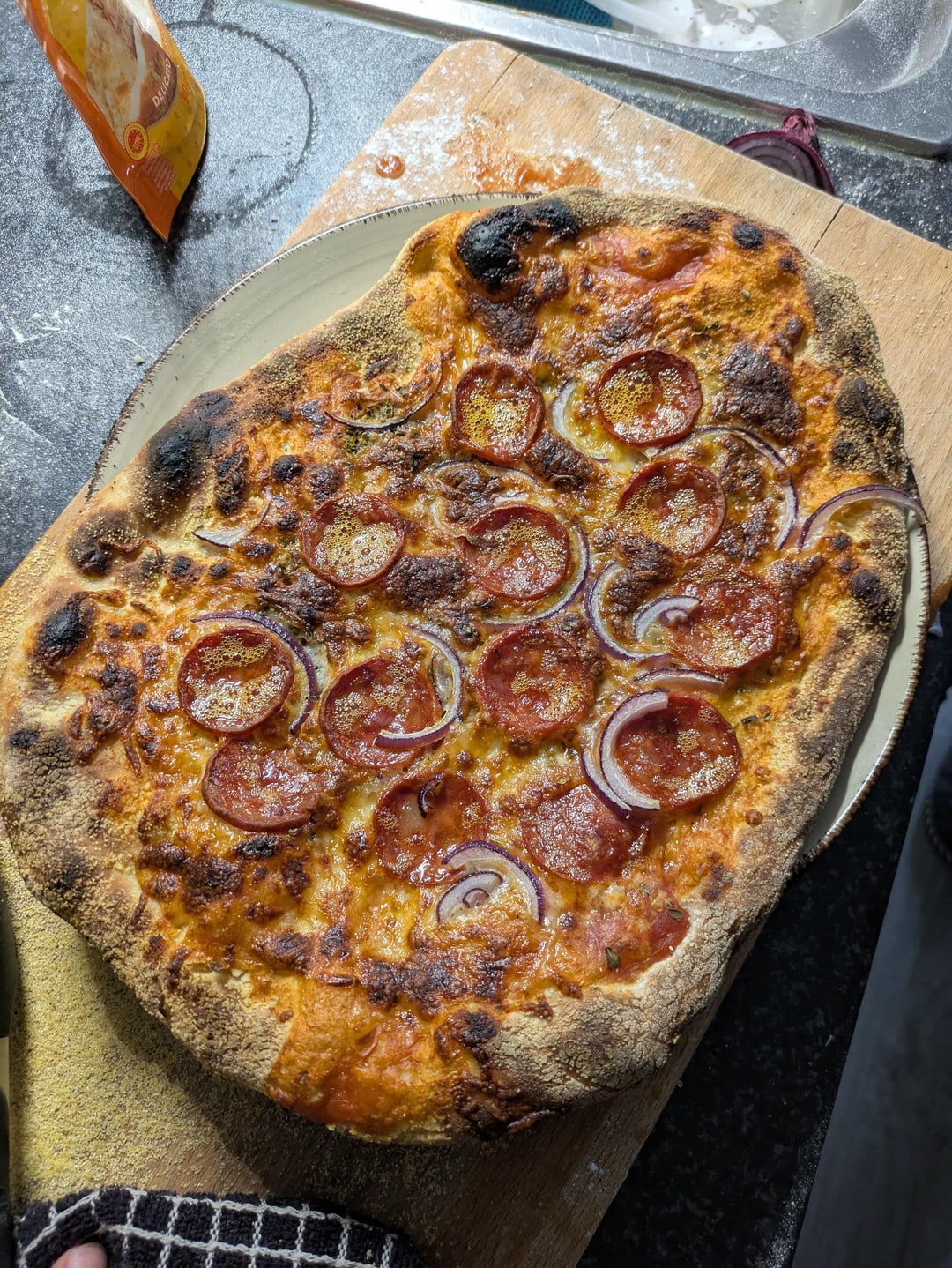 I'm really crappy at stretching the dough and everything but it was very tasty and I think it looks good. This is 62% I was trying to get a NY pizza style dough