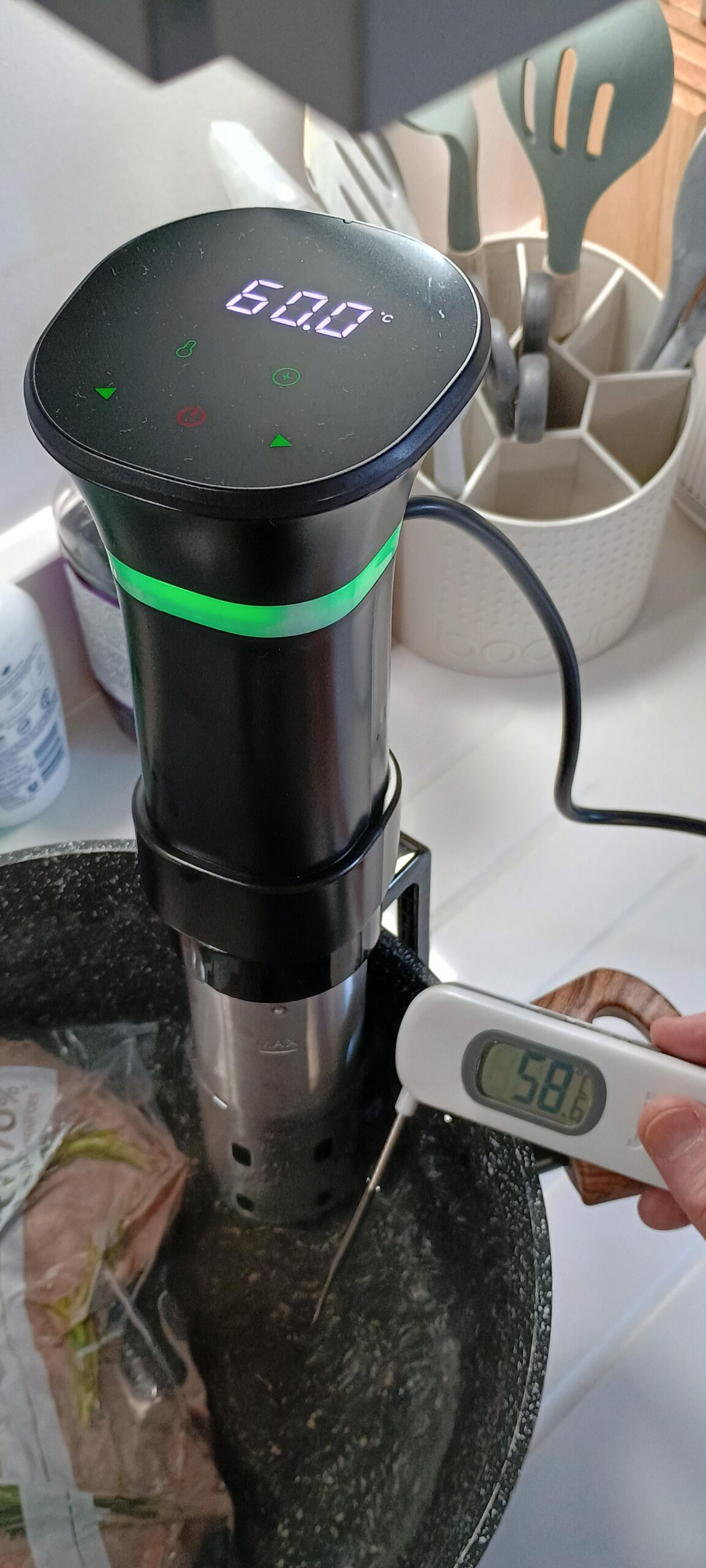 My Amazon budget sous vide (£50) is set at 60°c but my meat thermometer fluctuates between 58°c and 59°c ….. I'm guessing the meat thermometer is more acurate? The temperature readout on the sous vide constantly reads 60°c with no fluctuations