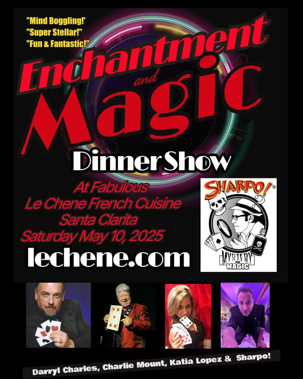 Join Le Chene French Cuisine for an evening hosted by Sharpo, a close-Up performer at the world famous Magic Castle, along with special guest star, top professional Magicians Darryl Charles, Charlie Mount and Katia Lopez.